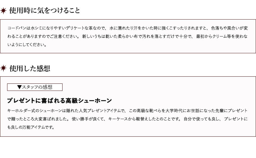 結婚3周年の記念日に渡すプレゼントを検討していたところ、こちらのホームページで素敵な商品を見つけました。初めての購入でドキドキしていましたが、商品の靴べらは素材もしっかりしていて、色もイメージ通りです。馬革なので長く使えそうと主人も嬉しそうでした。ありがとうございました。