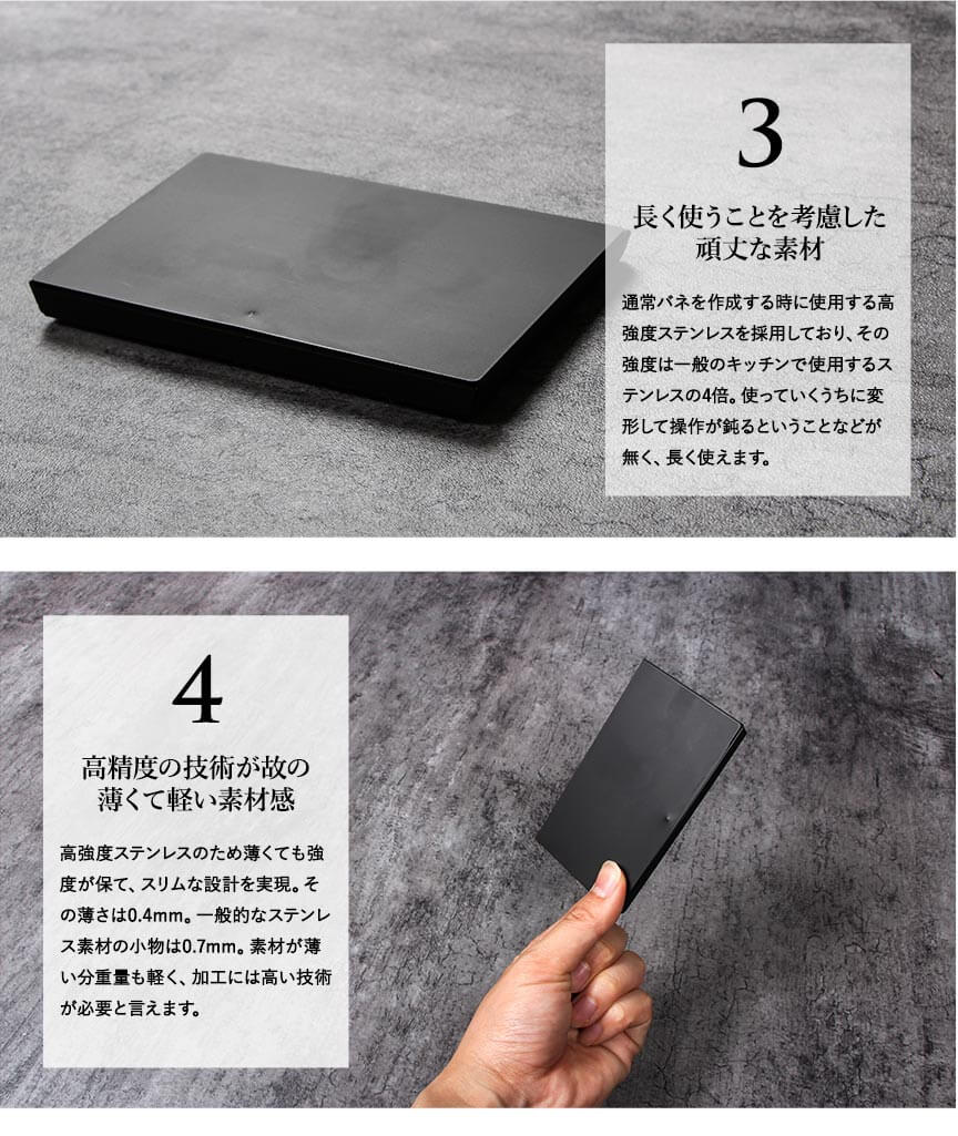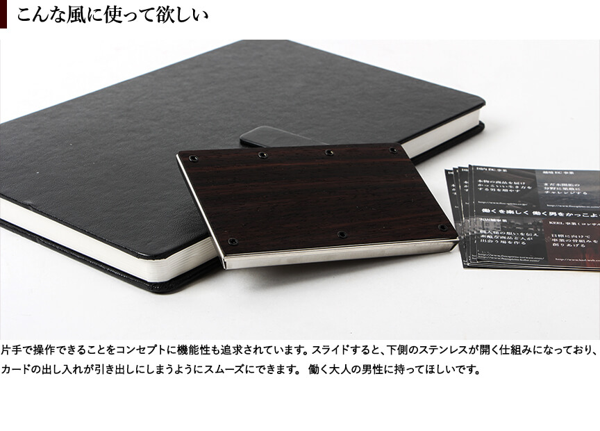 17mmのスライドさせるだけという最小限の動きでで名刺の出し入れを可能にする超薄型カードケース。