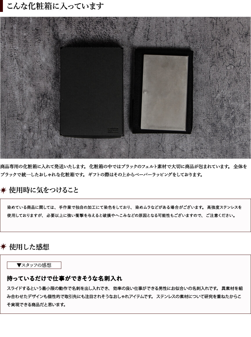 子供の就職祝いに購入しました。ありきたりの名刺入れでなくスタイリッシュと凄く喜んで貰えました。使い易いかどうかはわかりませんが、とにかく見た目がカッコいいです!
