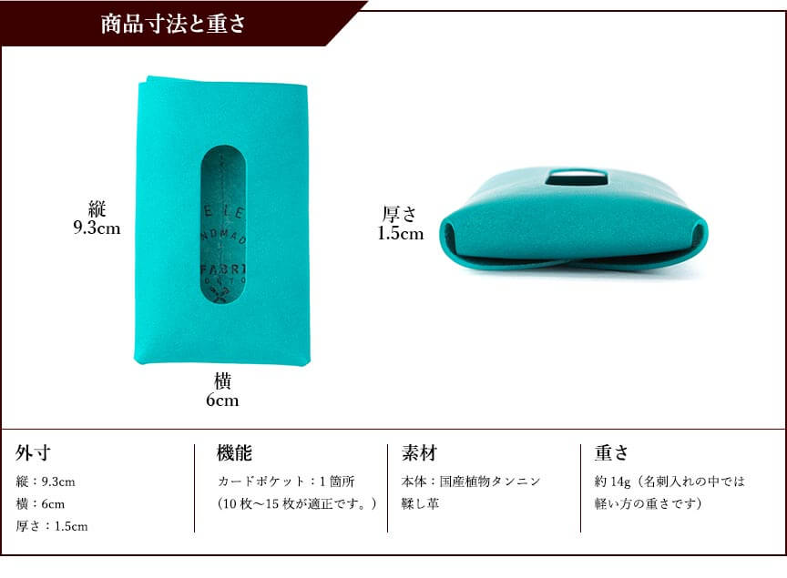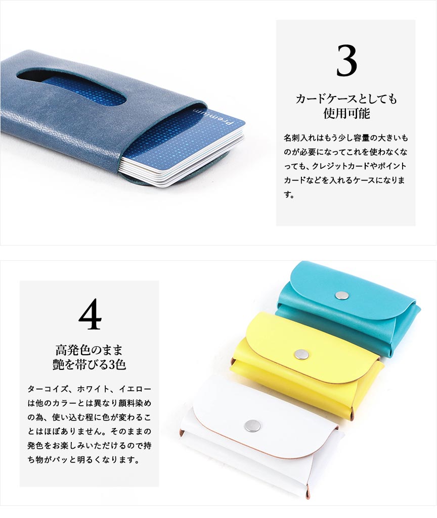 グリーンを購入しました。カード用にと思ったけど名刺が意外に入り、出し入れもスムーズで手のひらに収まるコンパクトさに満足しています。