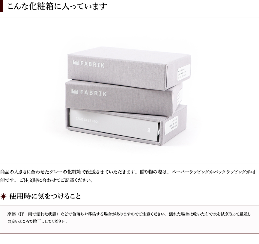 自分用に購入しました。 店舗で購入したカードケースと合わせて使用したいと思い、通販で購入しました。 丁寧な梱包で届きました。 肌触りも良く、手で撫でていると少しずつ触り心地も変化してきて、今後の経年変化が楽しみです。