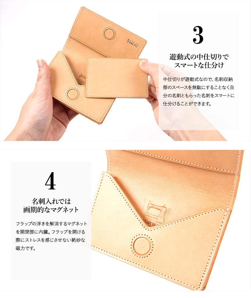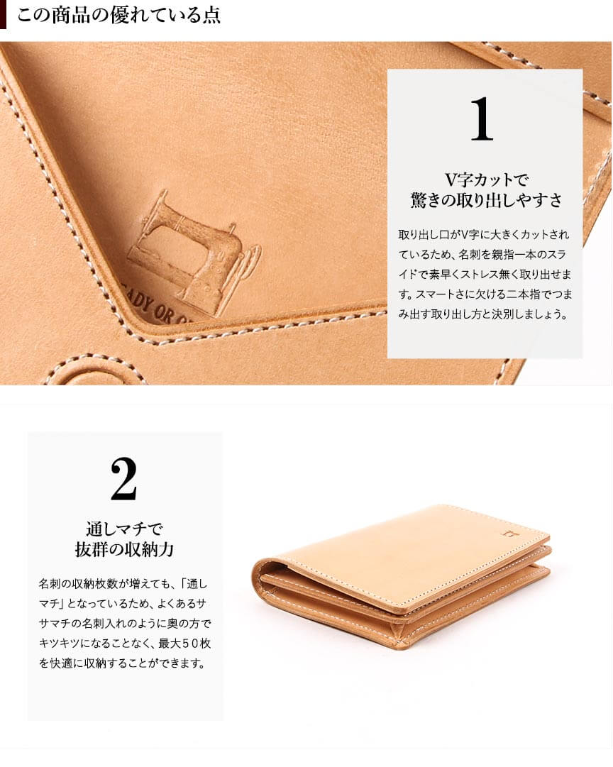 収納枚数:約50枚(遊動式中仕切り付) 最大の特徴は大きくカットされたV字の取り出し口。V字の頂点が丁度名刺の中央に来る位置にあり、親指で名刺をスライドさせやすいカットになっています。通常の名刺入れだと2本指で出すこともあるなどスマートさにかけましたが、このV字がその点を見事に解消しています。