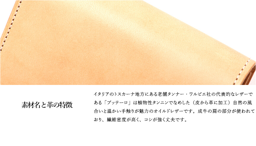 表革:牛革(タンニン鞣し) 内革:牛革(タンニン鞣し) *イタリアのトスカーナ地方にある老舗タンナー・ワルピエ社製牛革「ブッテーロ」