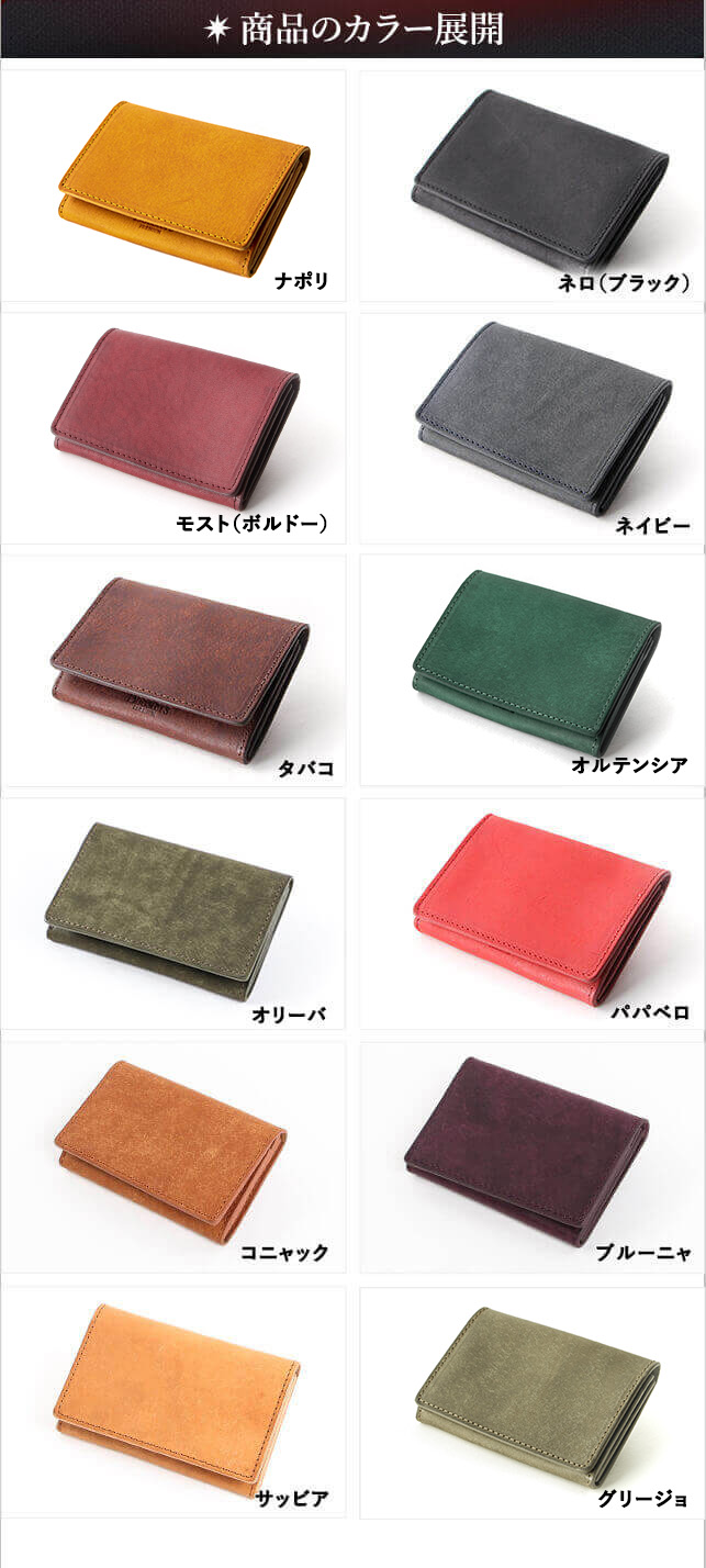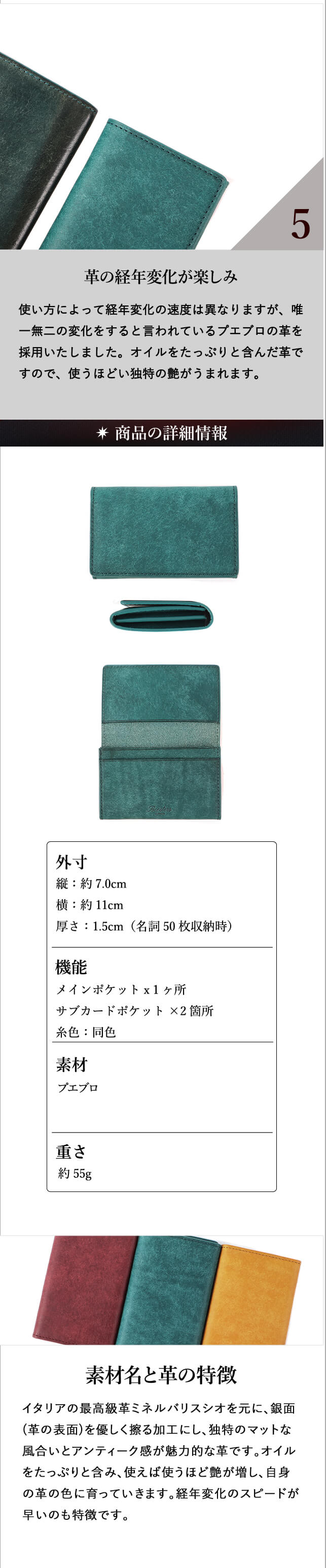 誕生日プレゼントで購入しました。暫く取引先へのご挨拶が続くとお聞きしたので、素敵な名刺入れだとテンション上がるかな…と勝手に考え、渋い紫色がお好きなので、こちらのプルーニャというお色を選ばせて頂きました。発注して2日で届き、確認させて頂きましたが、軽い感じのパープルでなく、本革らしい渋い色合いと素敵な革の香りで、落ち着いた大人の持ち物として満足して貰えると思います。
