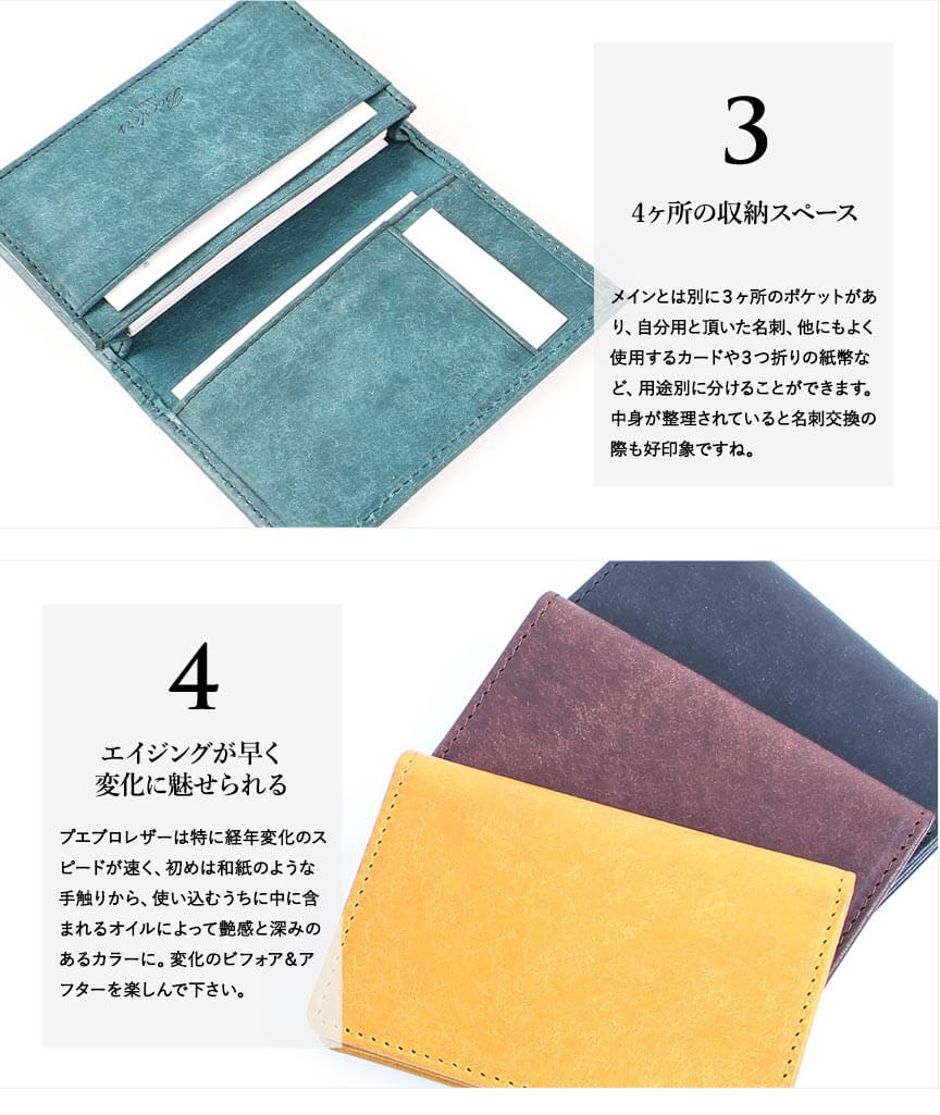 メインポケット以外に、サブポケット3箇所ついている名刺入れです。