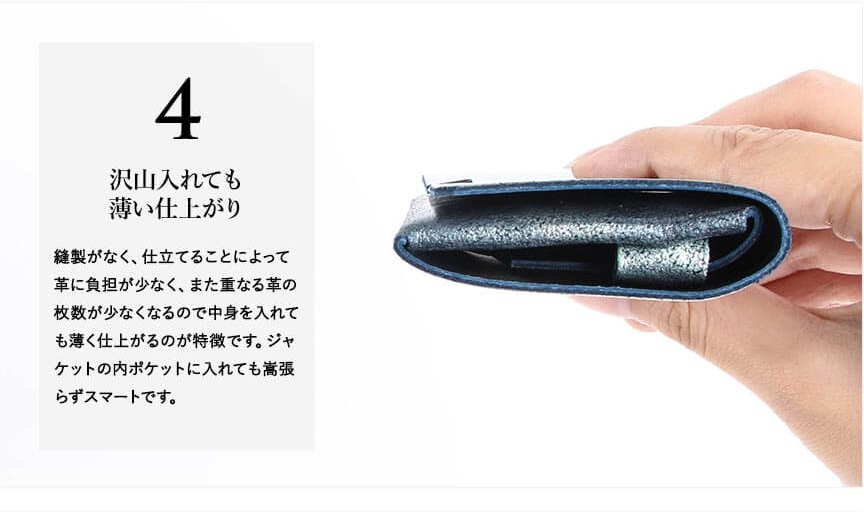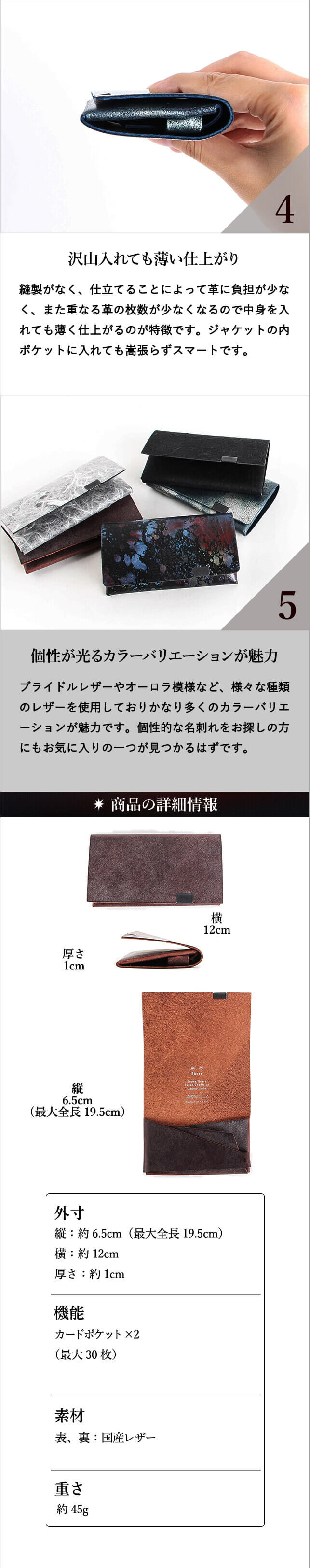 今回、所作のカードケース、色はブライドルブルーを購入させて頂きました。InstagramやYouTubeで詳細に紹介されており、購入後のイメージがしやすかったこと、一枚革で作られており一つ一つを丁寧に作られていることが決め手となりました。今後使用していくとともに経年劣化による皮の変化を楽しんでいきたいと思います。