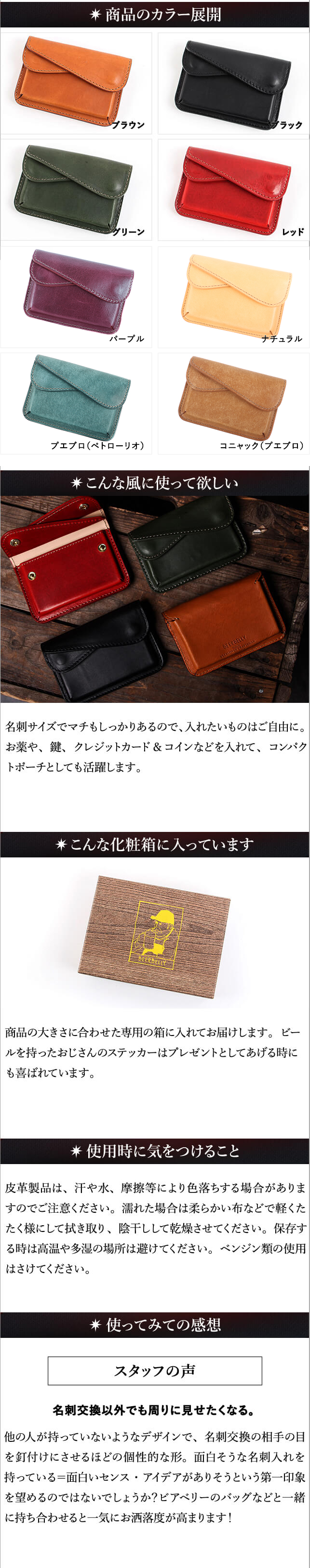 今回、名刺ケースをプレゼントで購入しました。 非常に材質がよく使っていくと色味が変わっていくのでプレゼントとしてはとても喜ばれました。また、特徴的な形をしており、なかな被らないと思います。非常に満足しました。ありがとうございます。