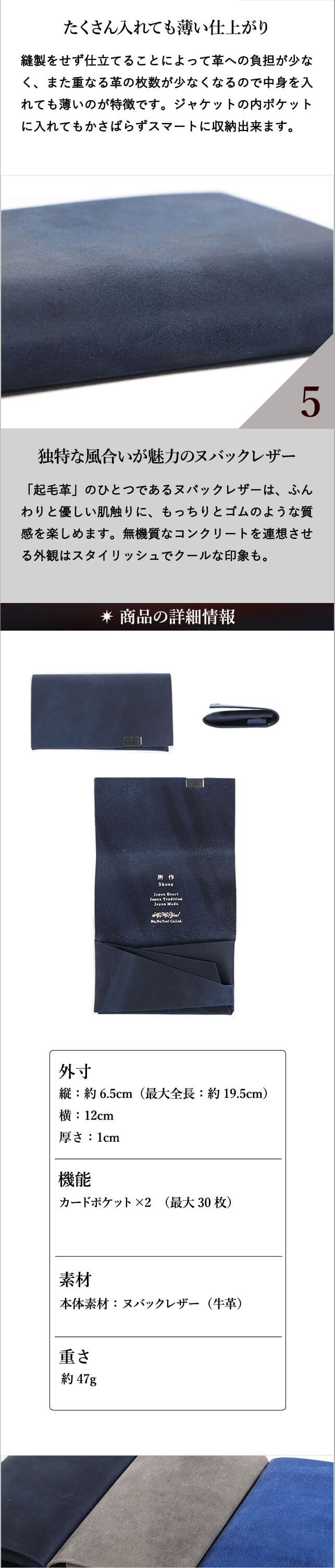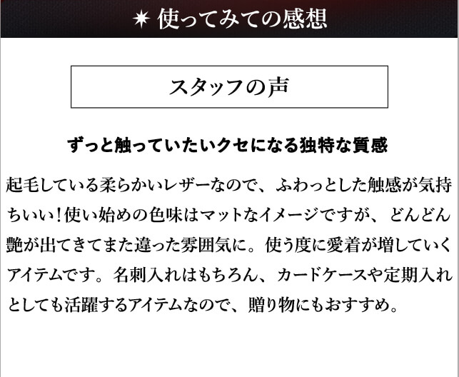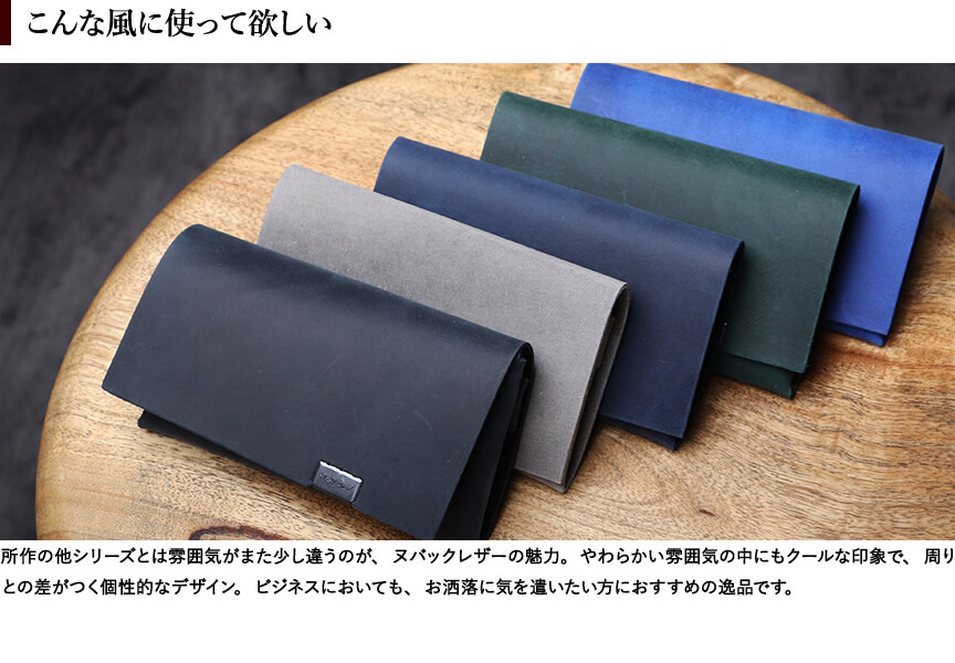 財布から所作にハマり名刺入れも購入しました。 慣れれば誰でも使いやすい革製品だと思います。 ヌバックの肌触り最高に良いです。