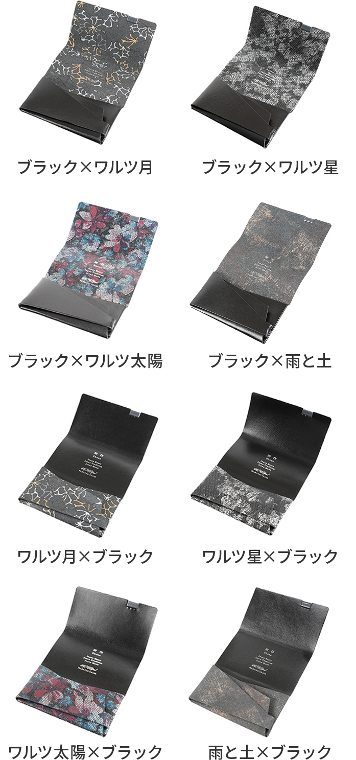 「ワルツ月」「雨と土」は型押し加工を施しており、使用による傷が目立ちにくくなっています。美しいプリントと独特の質感が印象的な、個性あふれる素材です。手作業で仕立てているため、ひとつひとつ表情が異なります。