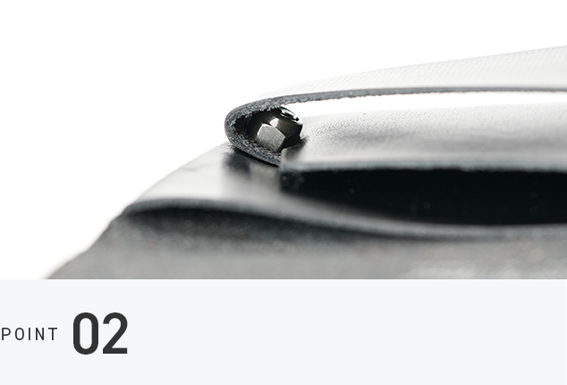 使用している素材は、革一枚とネジ一本のみ。ネジは有名テーマパークでも採用されるほどの強度を誇り、取れてしまう心配はありません。部品の存在を感じさせない、シンプルで美しい仕上がりです。