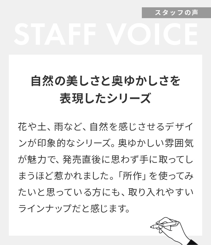 花をモチーフに、「ワルツ太陽」「月」「星」の3種類と、「雨」「土」の4種類が新たにラインナップ。奥ゆかしい花の美しさや雄大な自然を、「所作」らしい洗練されたデザインで感じながら楽しめます。