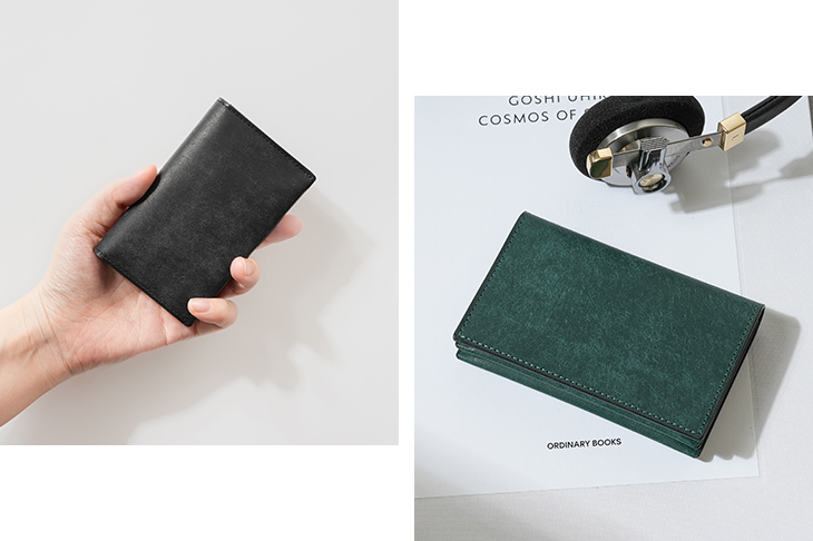 手にした瞬間、和紙のように乾いた独特の質感に驚かされます。使い込むほどに内側のオイルがなじみ、数ヶ月後にはしっとりとした潤いと光沢のある表情へと変化していきます。この変化は、“自分だけの名刺入れを育てる”ような楽しさがあります。傷も味わいとして馴染み、自然と会話のきっかけになるビジネスのパートナーです。