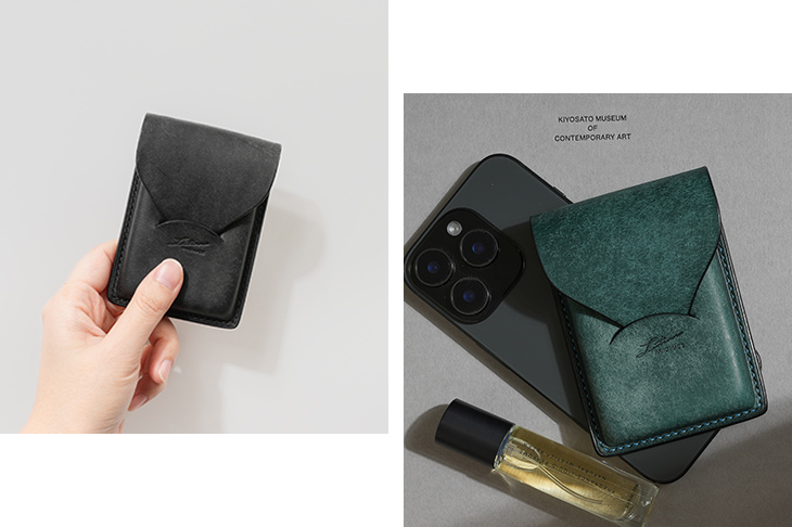 縦型名刺との相性に優れ、横型名刺の収納にも対応。コンパクトで取り出しやすい設計でありながら、立体フォルムと磨き抜かれたコバが大人の重厚感を演出します。豊富なカラー展開とともに経年変化も楽しめるため、使うほどに愛着が深まります。裏面ポケットは使い分けやICカード収納にも便利で、機能性にも配慮しています。