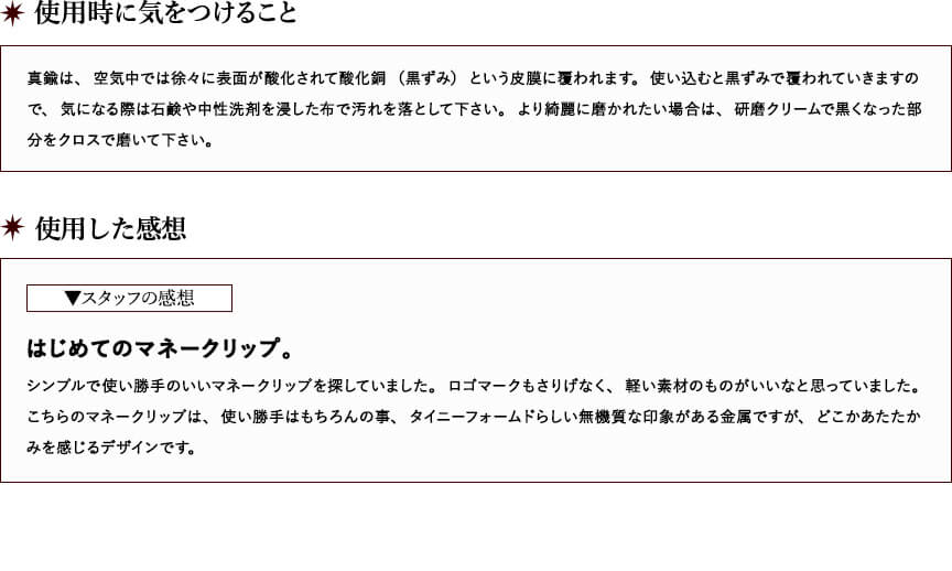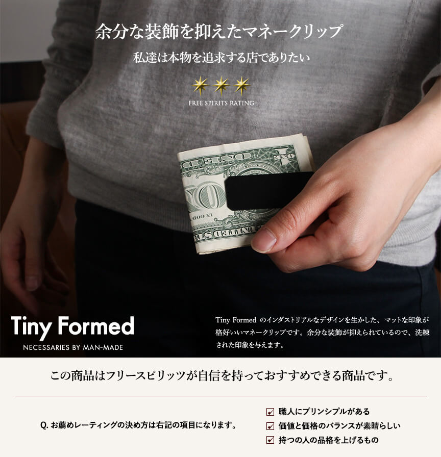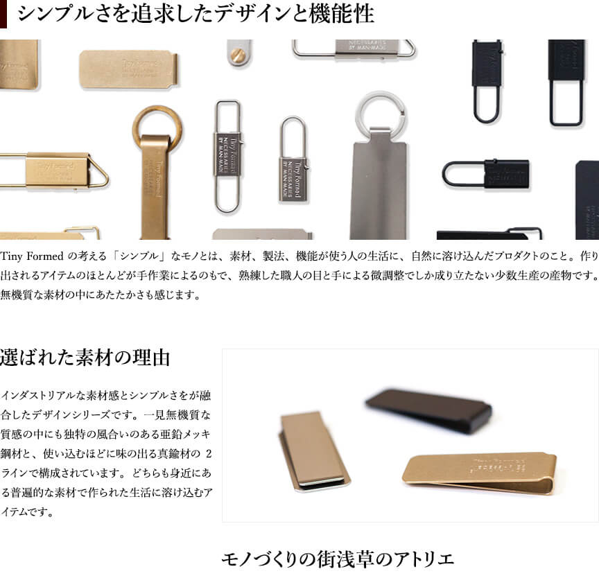 Tiny Formedのインダストリアルなデザインを生かしたマネークリップ。真鍮の素材感は高級感があり、洗練された印象を与えます。