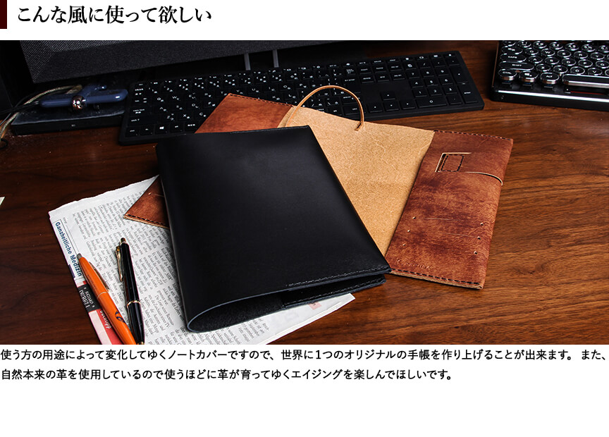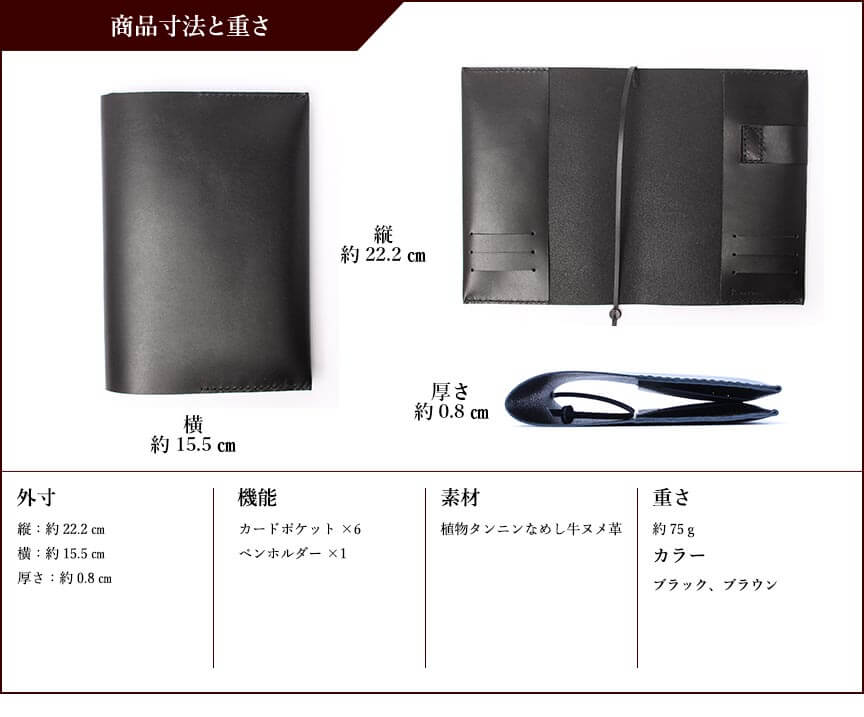 スライド式ペンホルダー×1 カードポケット×6 *カードポケットには名刺以外に付箋やクリップなどが収納可能 *ご使用できるノートの厚みは15mmまでです 16mm以上のノートにお使いの場合は特注で見積りの上製作いたします。 備考欄にノートの厚みをご記入ください。