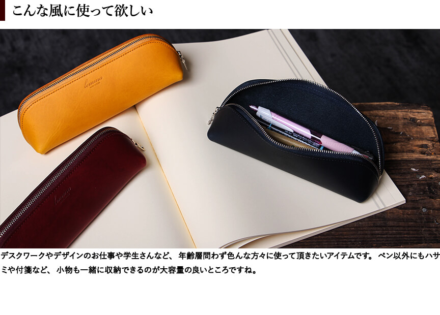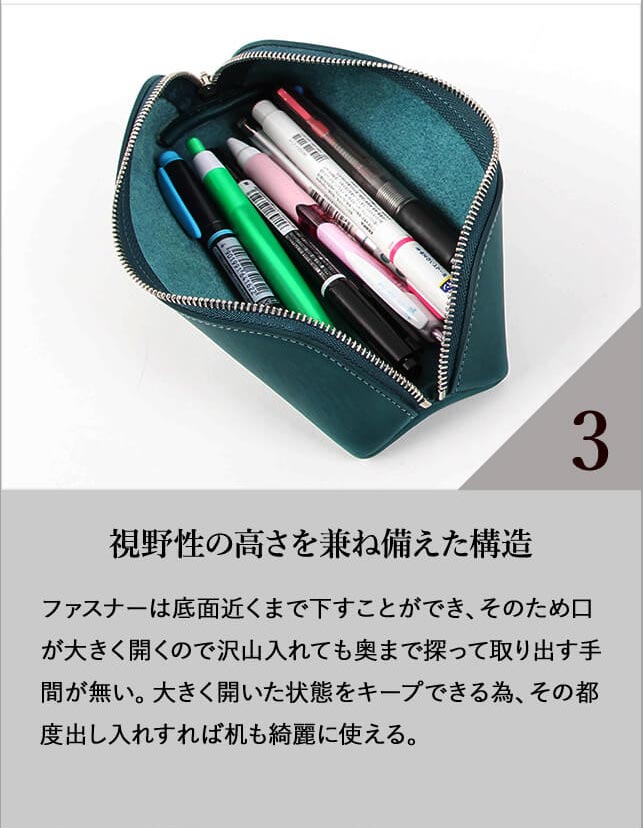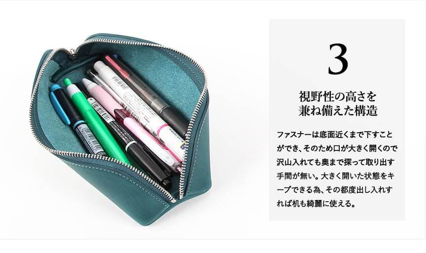 今回バルコペンケースミネルバリスシオを購入させて頂いたものです。自分はガバっと開いて取り出しそうなペンケースが欲しかったのですが丁度あったので選びました。見やすく、どの位置に物があるか分かるので気に入っております。