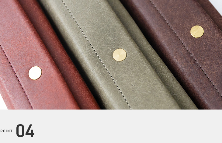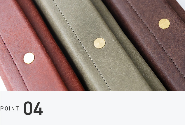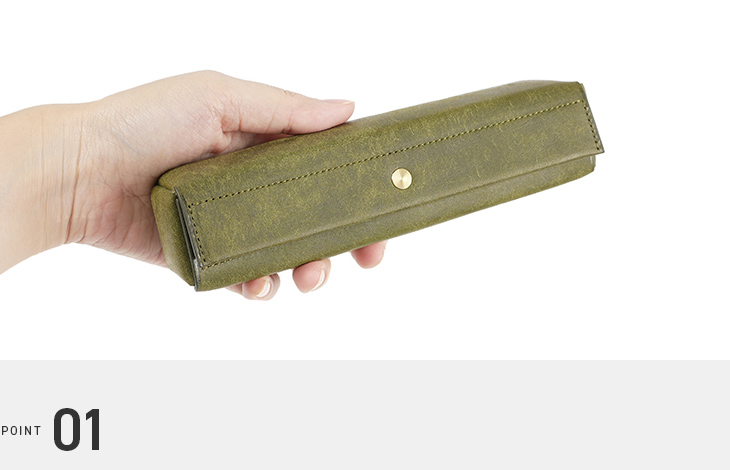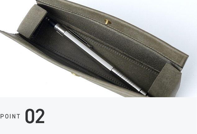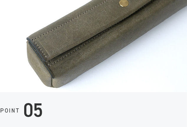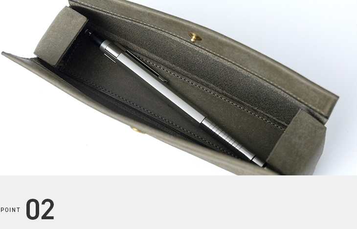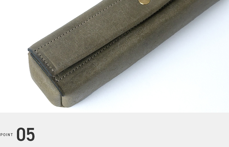 一般的なファスナーやマグネットではなく、面の美しさを際立たせ、歪みにも強いホックを採用。しかも、数々のメゾンブランドでも使われる信頼のプリム社製。強度と上質さを兼ね備えた、特別なペンケースです。