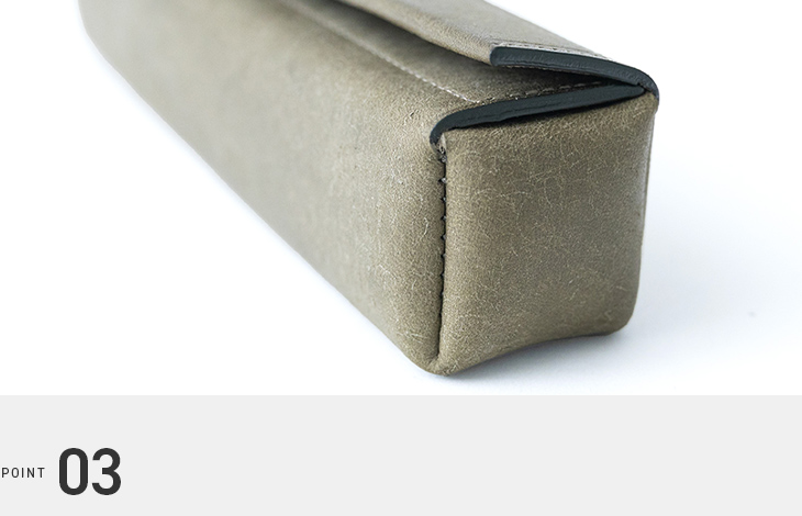 3箇所に芯材を仕込み、面の美しさと角の強度を高めています。使うほどに革の繊維がほぐれ、手に馴染む質感へと変化します。本革特有のフォルムの変化を損なうことなく、箱としての強度を維持するための職人技です。