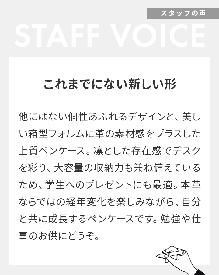 発売されるときいた時から、絶対欲しい!と思っていたので、届いた時にはすごく嬉しかったです。金色のホックと革の相性がとてもいいなと思ってます。ペンも10本ほどは余裕で入るのでオススメです