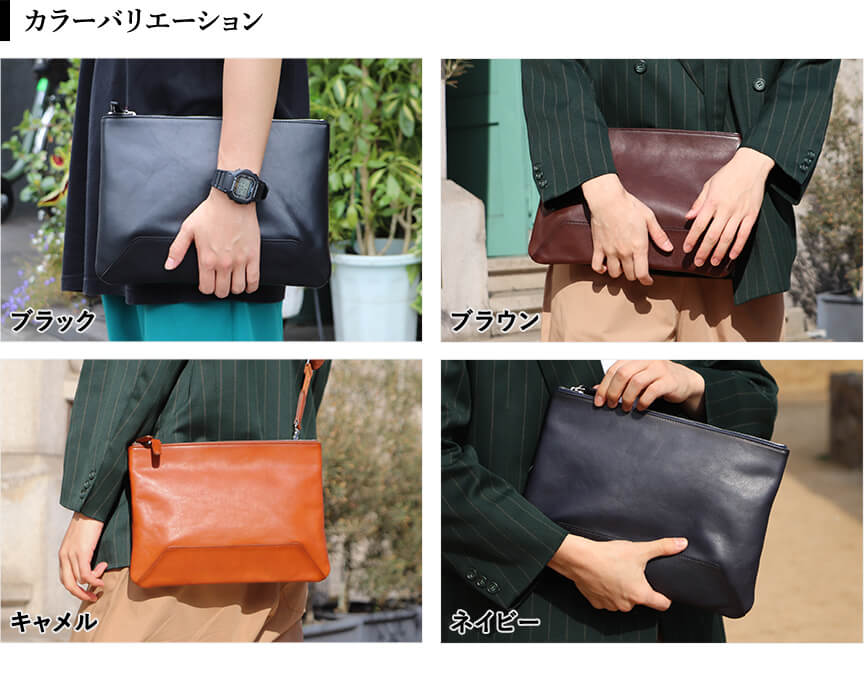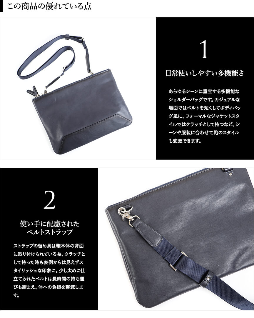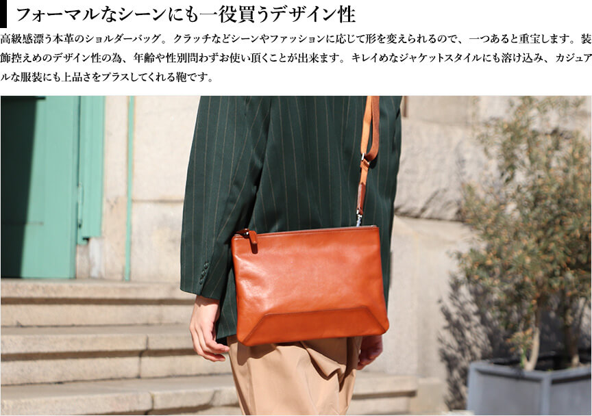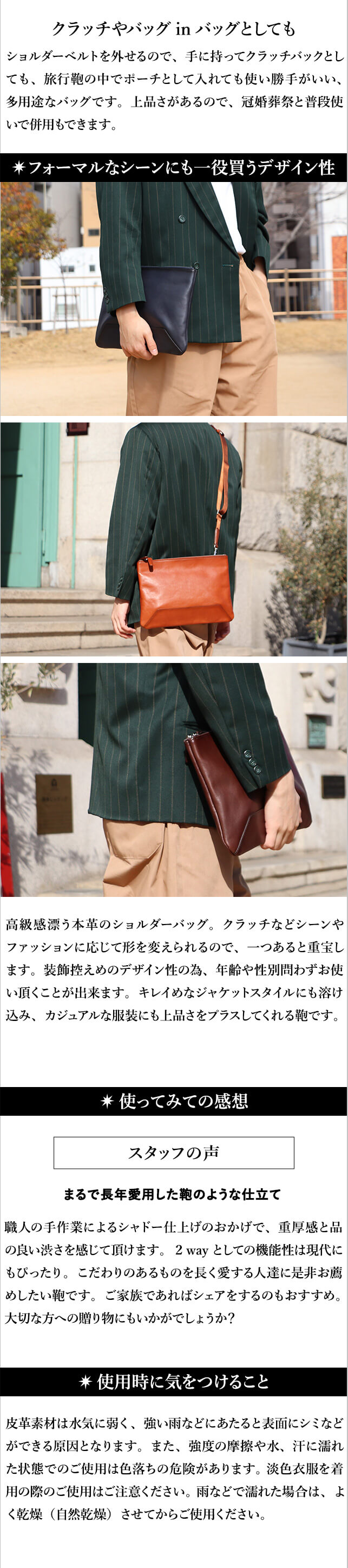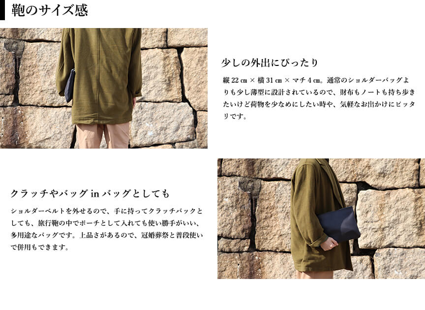 三層式になっており、薄マチですが収納力抜群のサコッシュです。ショルダーは取り外し可能でクラッチバッグやバッグインバッグとしてもお使いいただけます。