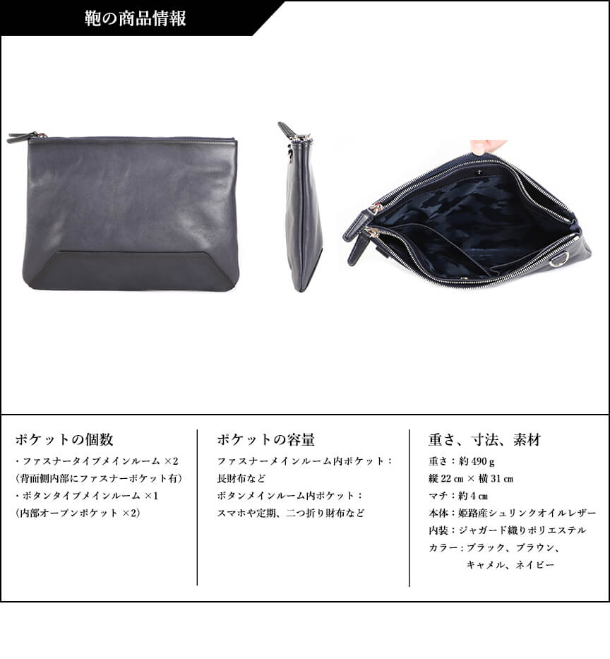 本体:姫路産シュリンクオイルレザー、内装:ジャガード織りポリエステル