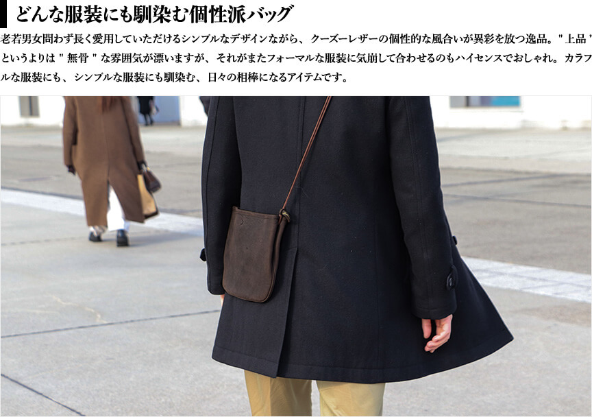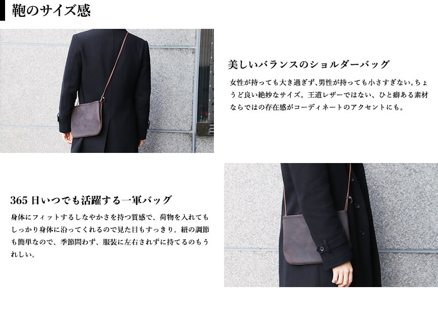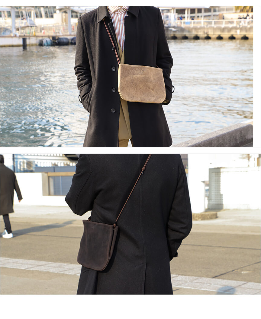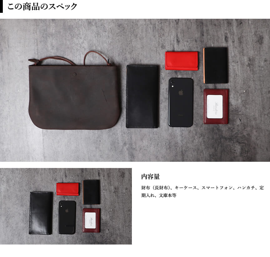 軽く出掛けるのに、財布、携帯、モバイルバッテリー、ハンカチなどを入れて緩くふんわり包んでくれてとても良いサコッシュです。 また、クードゥーの革との事で、とても丈夫で生体傷が模様のようで見てても楽しい製品です。