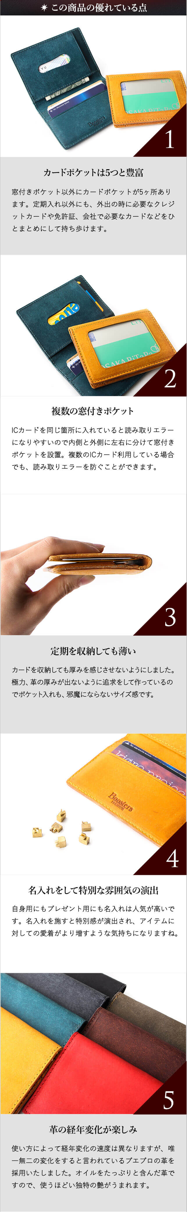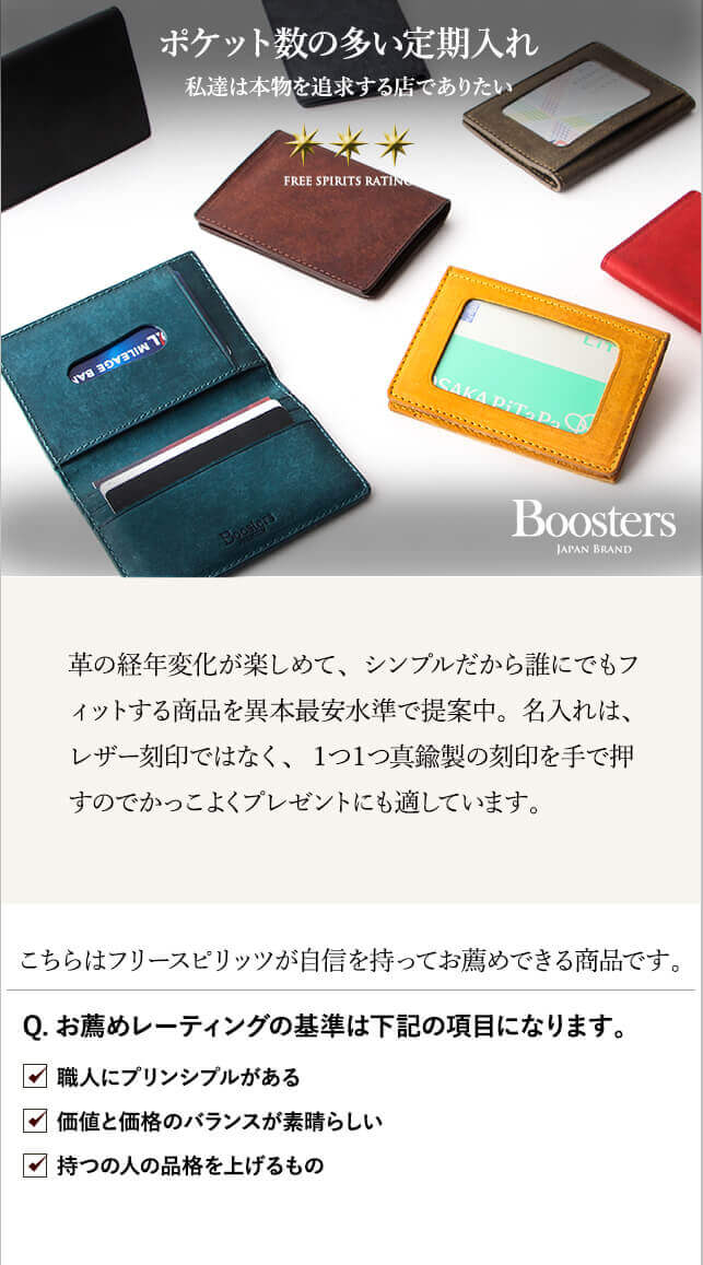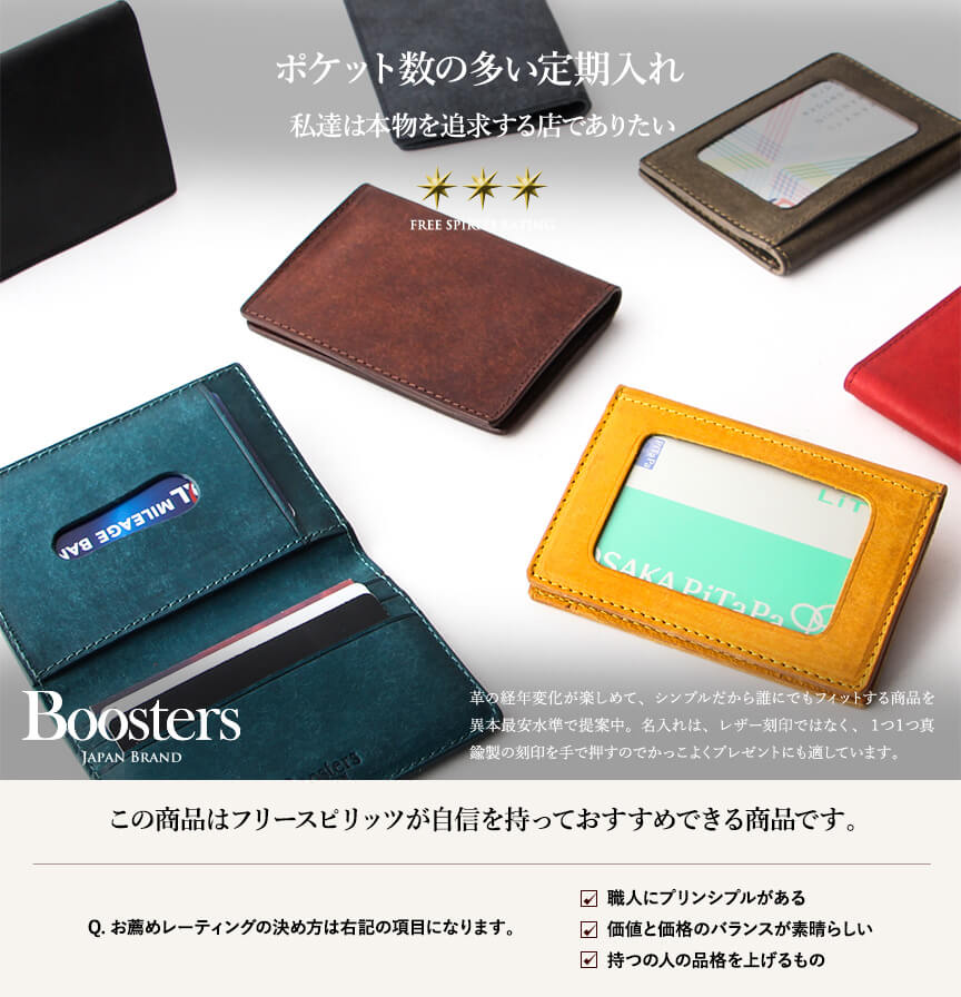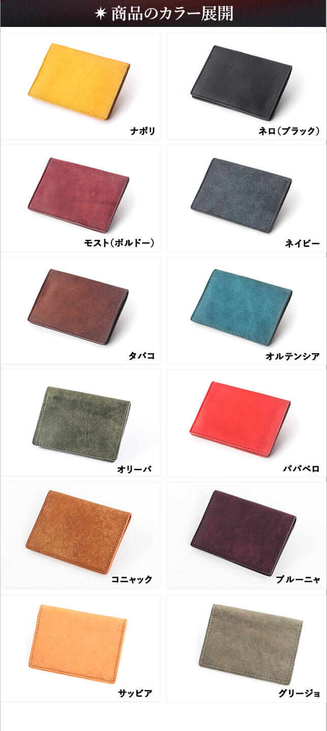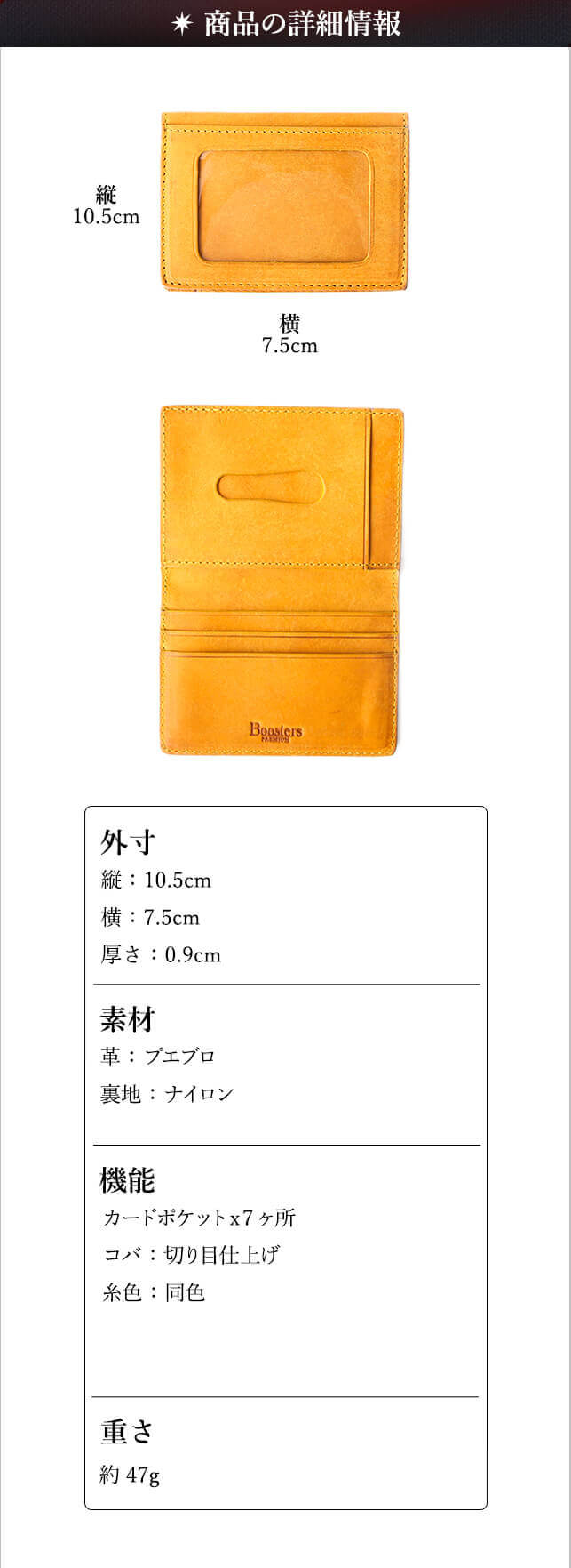 【サイズ】 外寸:縦10.5cm×横7.5cm×厚さ0.9cm 【重さ】 約47g 【素材】 革(イタリアンレザー):プエブロ 【生産国】 バングラディッシュ 【仕様】 カードポケット×7ヶ所 コバ:切り目仕上げ 系色:同色