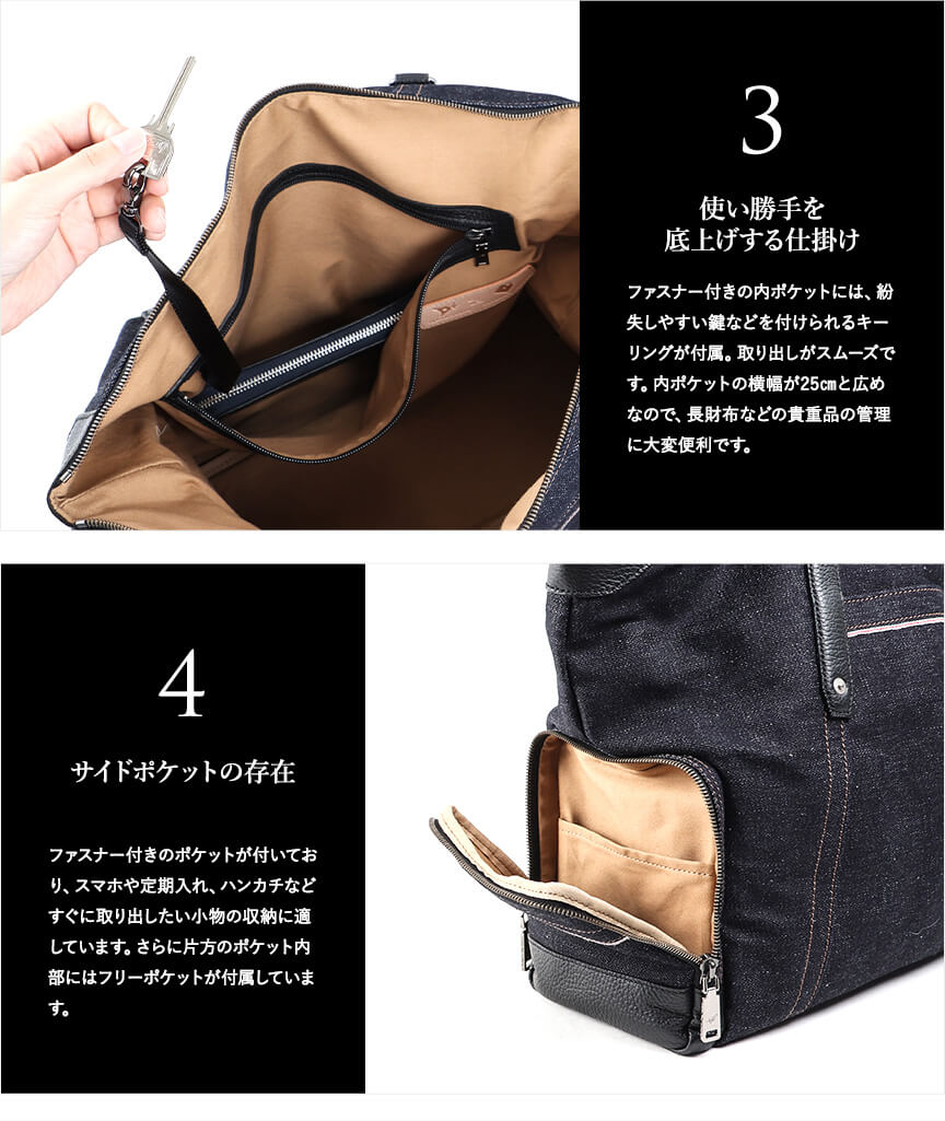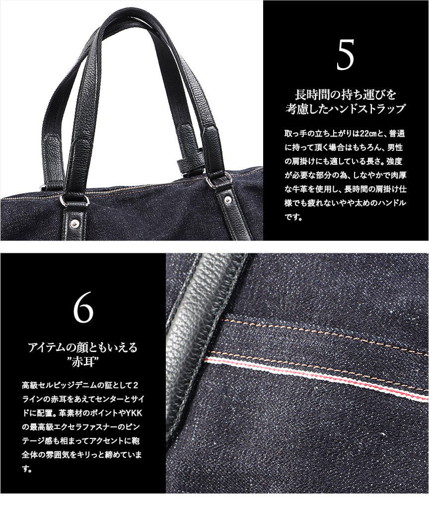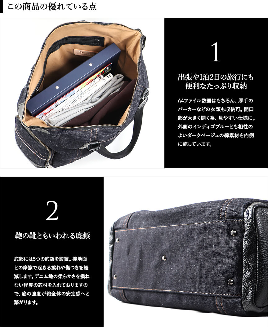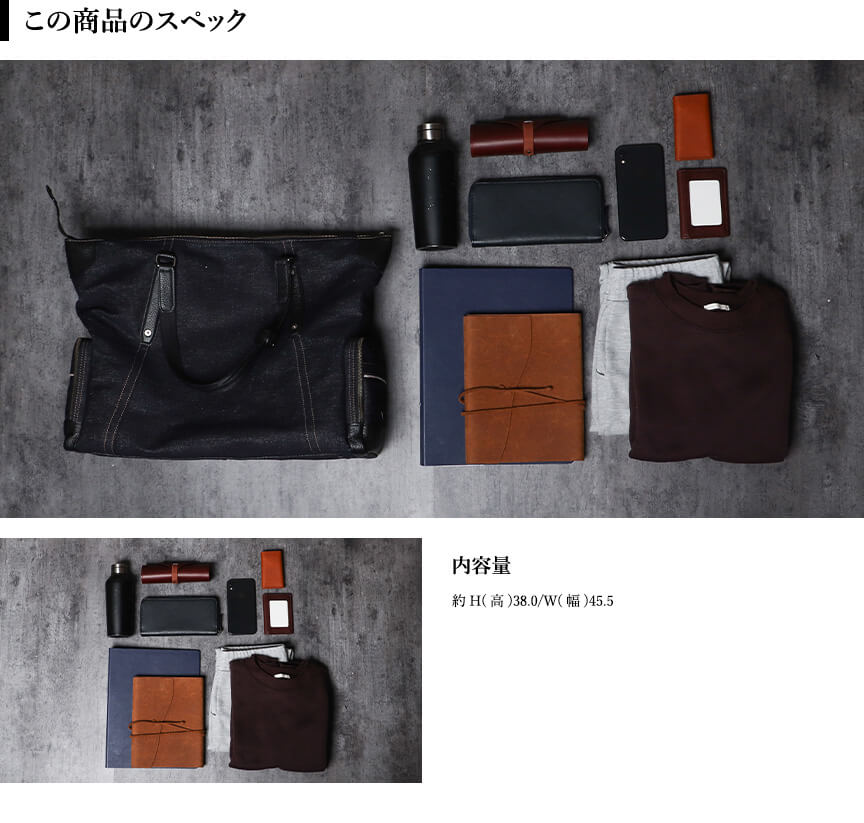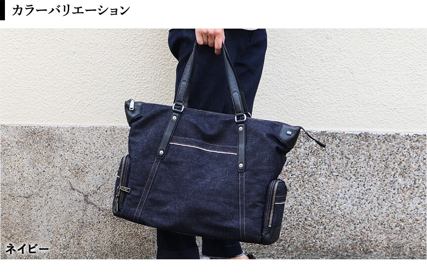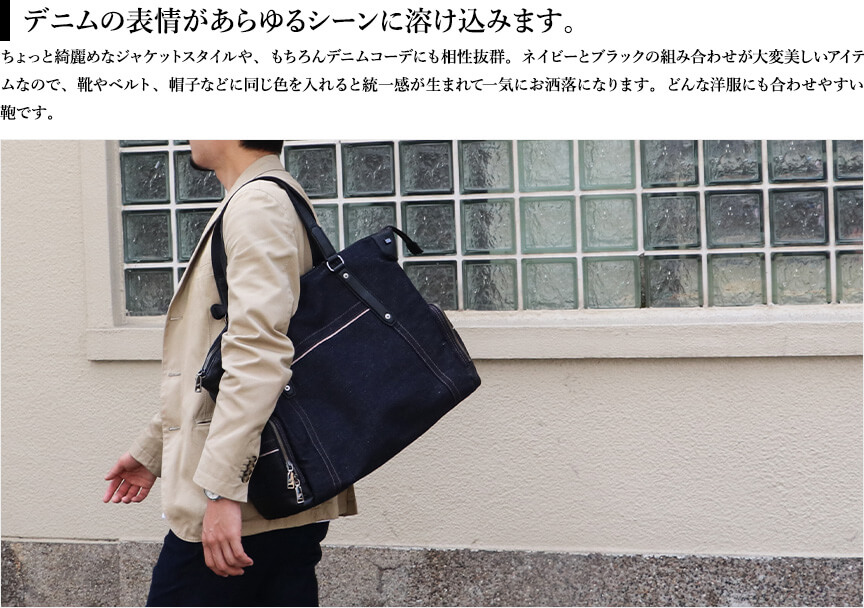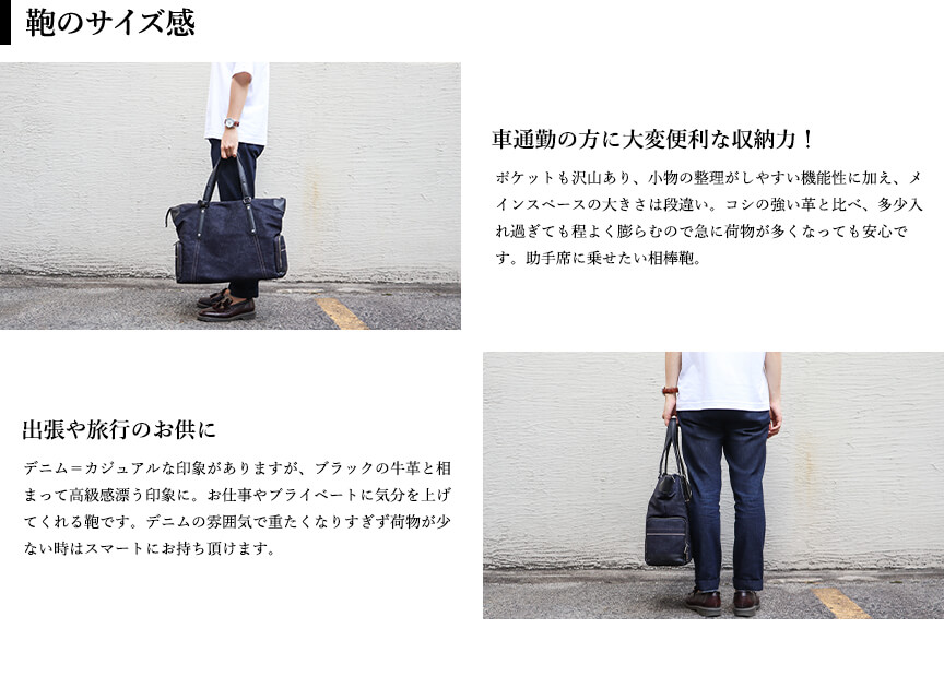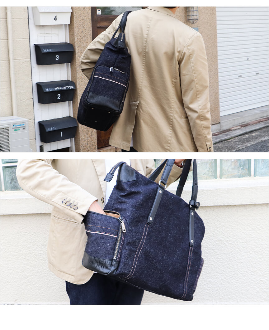 〈本体素材〉井原デニム〈付属素材〉牛革〈内装生地〉綿