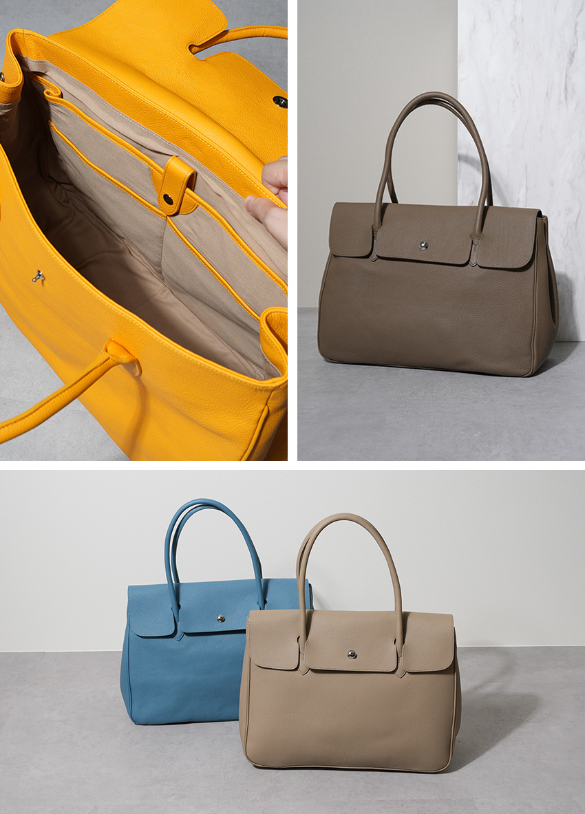 フランス製の上質な牛革を贅沢に使用した、高級感あふれるトートバッグ。革の表情を存分に感じてもらえるように、デザインはミニマルにしました。近くで見ると、革の上質なきめ細かいシボ感が豊かな表情を感じられ、遠くで見ると、シンプルで洗練された佇まいが、コーディネートの品格を高めてくれます。様々な角度から見ても美意識が感じられるバッグです。