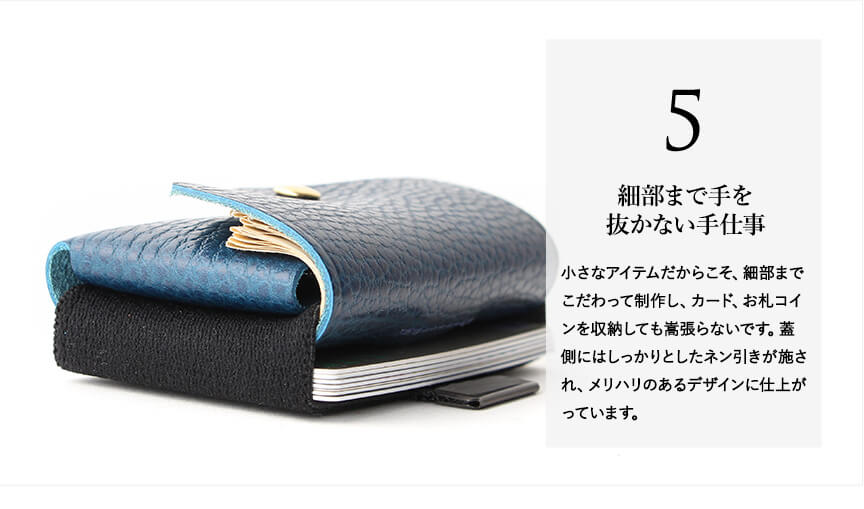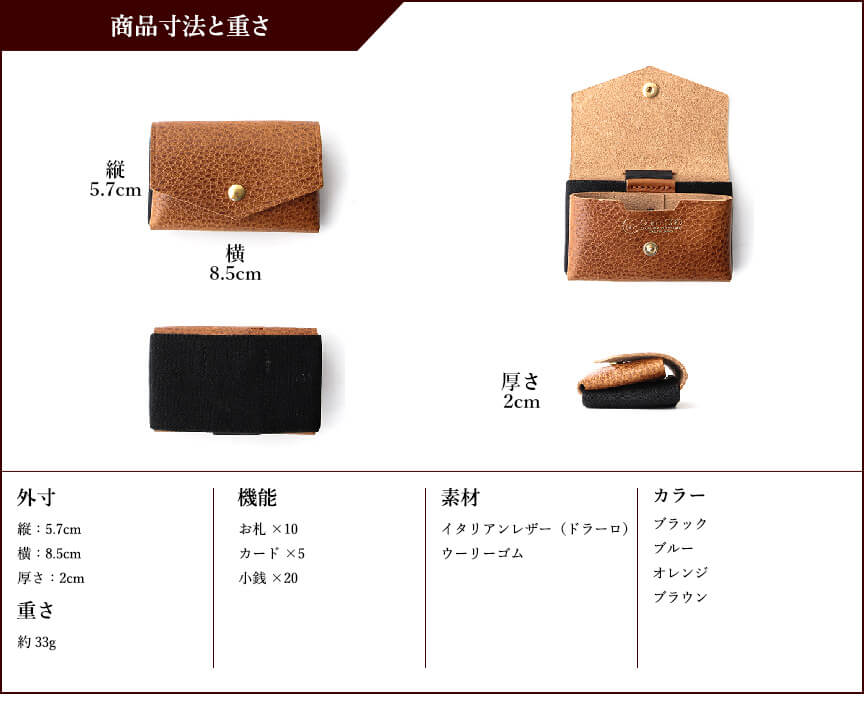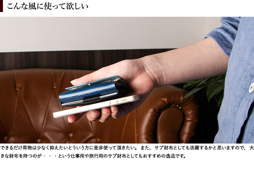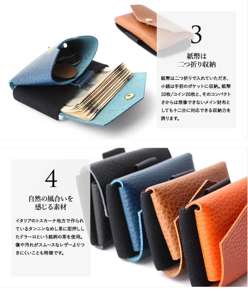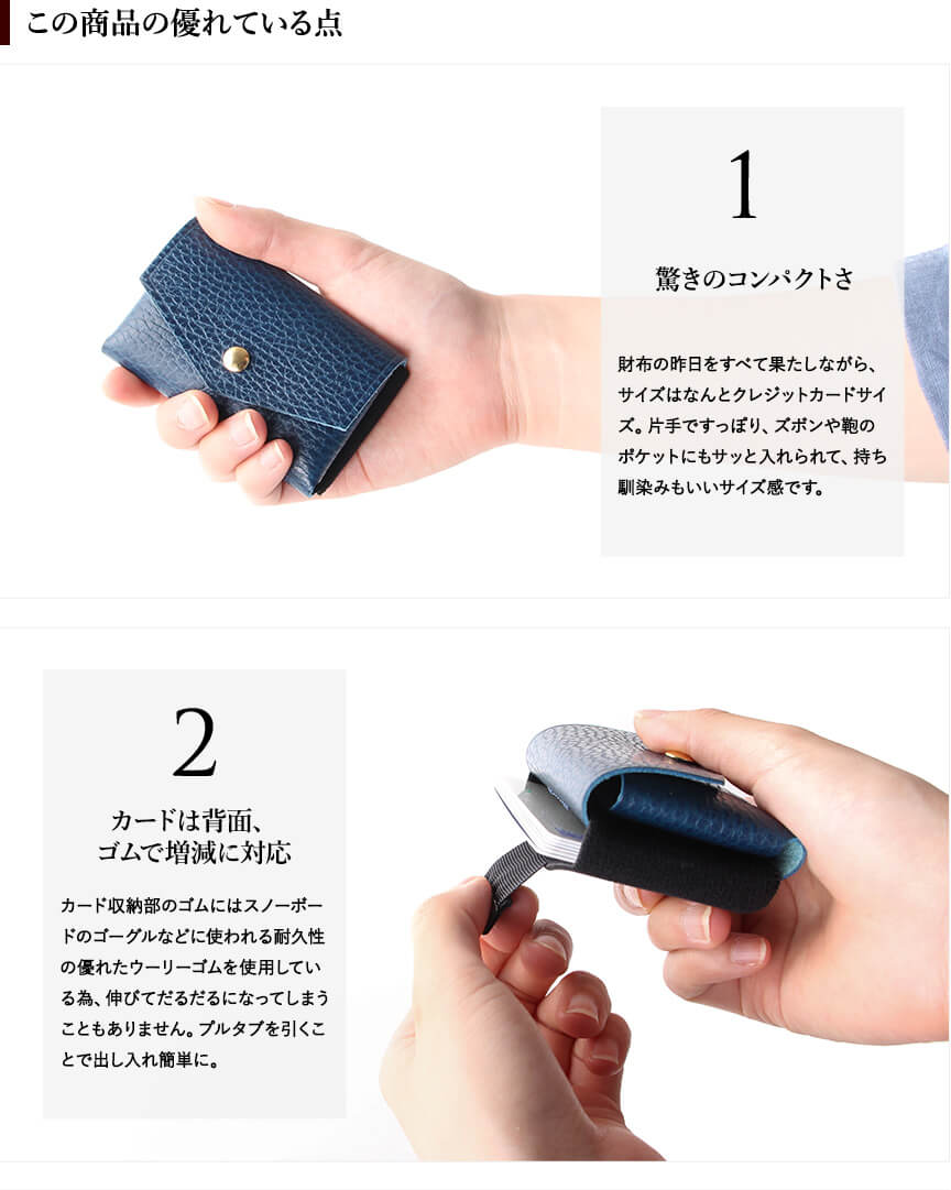 まず見た目がカッコいいです。 すごくコンパクトなのにカード、お札、硬貨と余裕で収納出来ます! カード収納の取り出し方が画期的でいっぱい入るのにすごく取り出しやすいです。 ポケットにすっと入るのでちょっとのお出かけや旅行に行く時のセカンド財布として最高です✨ この小ささでメインの財布としても使える本当にいい財布で買って良かったです❗️