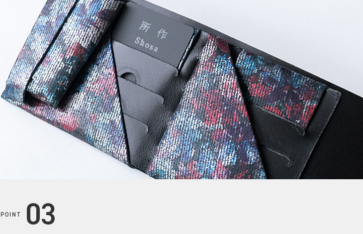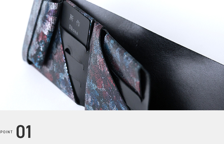 「所作」は、日本の美しい伝統文化を現代に取り入れたユニークな財布です。1000年以上続く布で大切なものを包む心遣いを、日常で使う財布に反映しました。コンパクトな2つ折りサイズで、そのデザイン性をぜひお楽しみください。