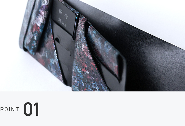 蓋部分を片手で持ったまま下へくるりと回すと収納部分が現れ、開いたマチを財布の持ち手で支えることで、お会計時もスマートな所作に。折形(おりがた)をモチーフにしたデザインが、和の心を感じさせます。