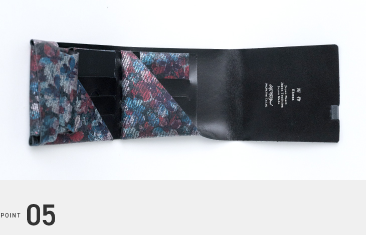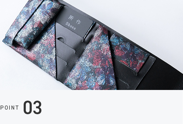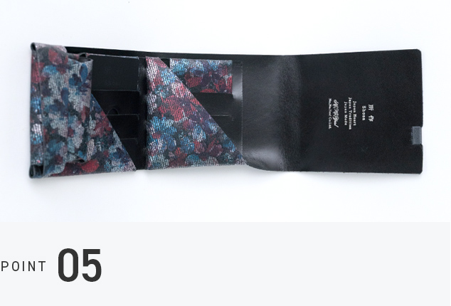 結婚式などでお祝いを包む一枚の布「袱紗(ふくさ)」をモチーフに、日本の伝統の美しさを革小物で表現しています。贈答品を包む古い様式「折形」の、革が折り重なる様子をデザインに取り入れています。礼の心を形に表す、日本だけに受け継がれてきた歴史がある美しい様式を現代の革小物に採用しています。