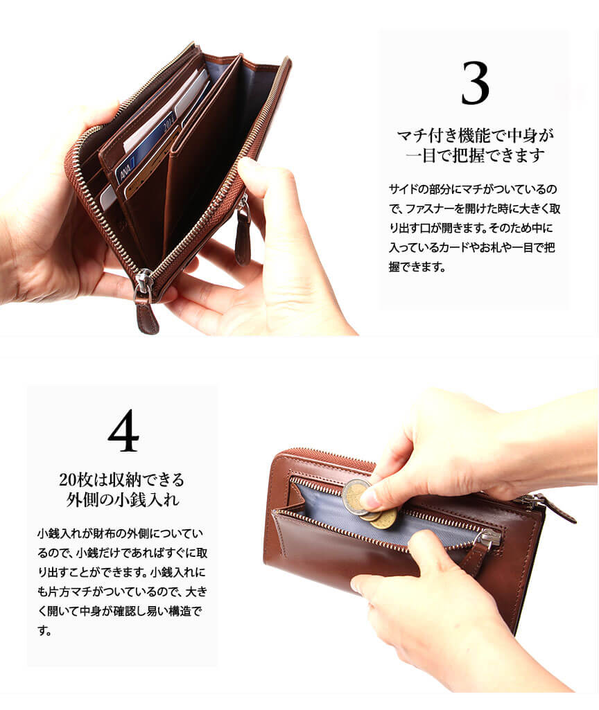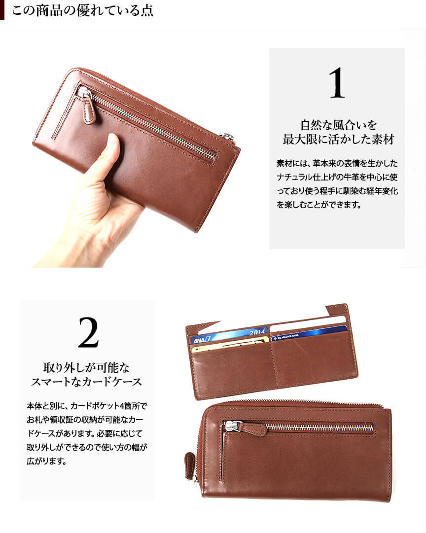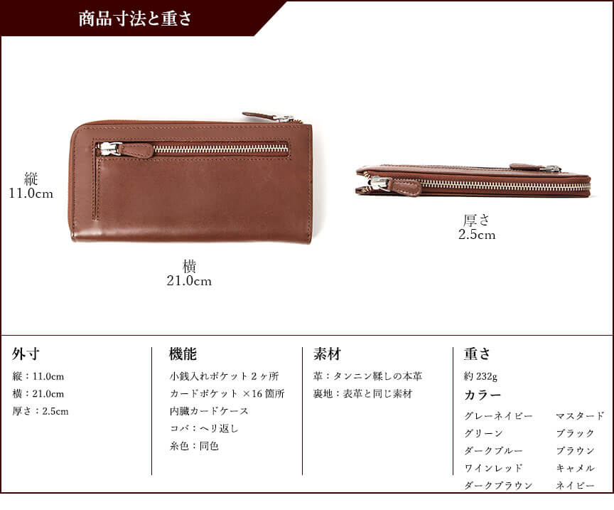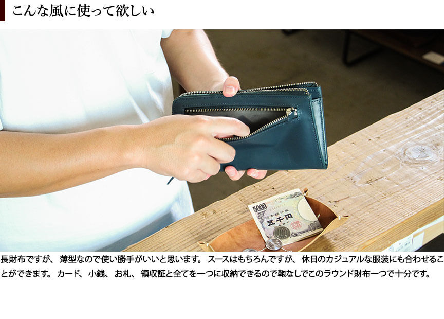 【サイズ】 H11×W21×D2.5cm 【重さ】 約232g 【素材】 タンニン鞣しの本革 【生産国】 バングラディッシュ 【仕様】 小銭ポケットも多く、スマートにカードの出し入れができるおしゃれなL字のラウンド財布です。