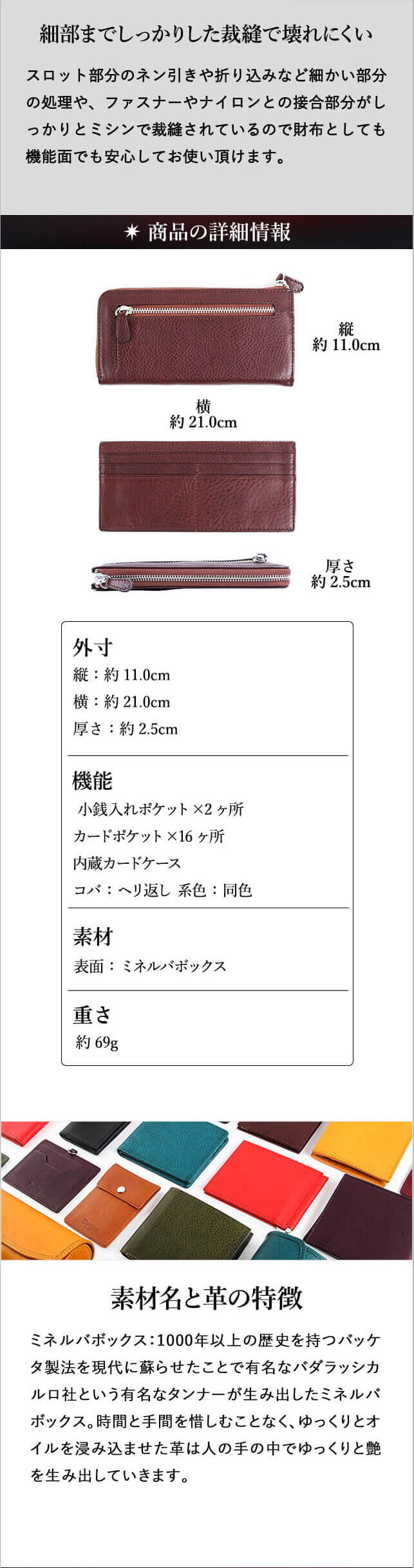 小銭入れポケット×2ヶ所 カードポケット×16ヶ所 内臓カードケース コバ:ヘリ返し 系色:同色