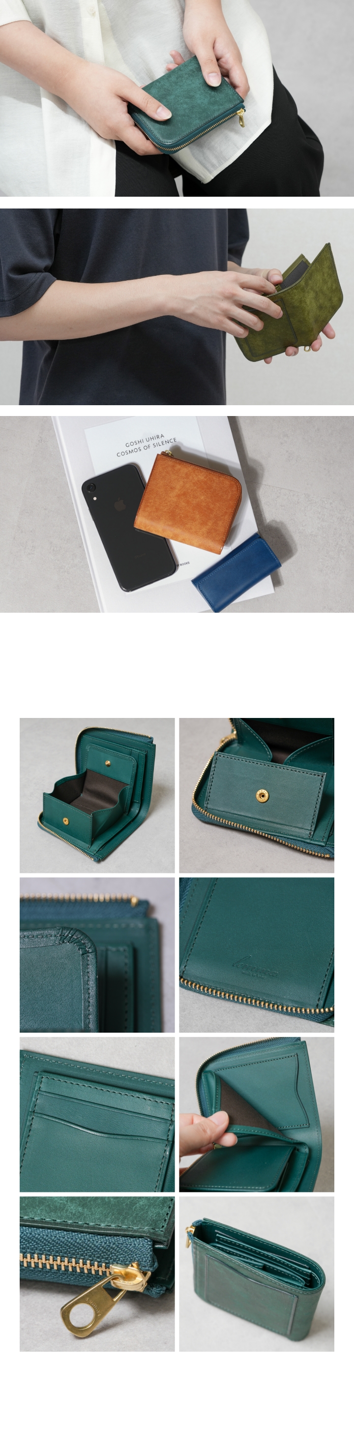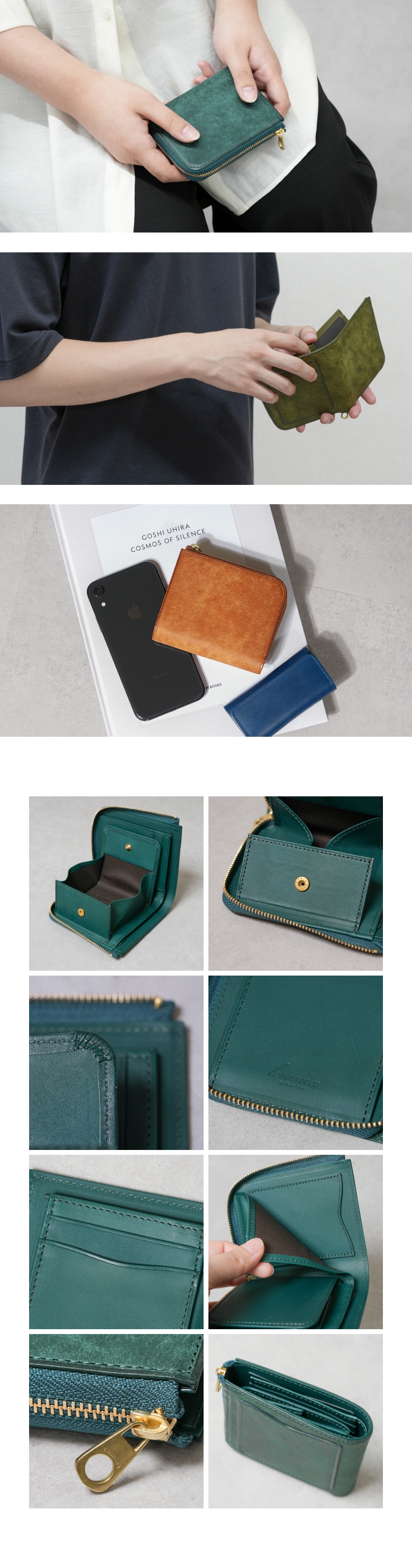 lemmaでは初となるL字型ウォレット。 見た目に反して収納力は抜群で、カードは約10枚まで収納可能です。 小銭入れにはボックスタイプを採用しており、 コンパクトな財布にありがちな小銭の取り出しにくさも心配ありません。 革には、lemmaでお馴染みのプエブロレザーを使用しており、 経年変化も存分にお楽しみいただけます。