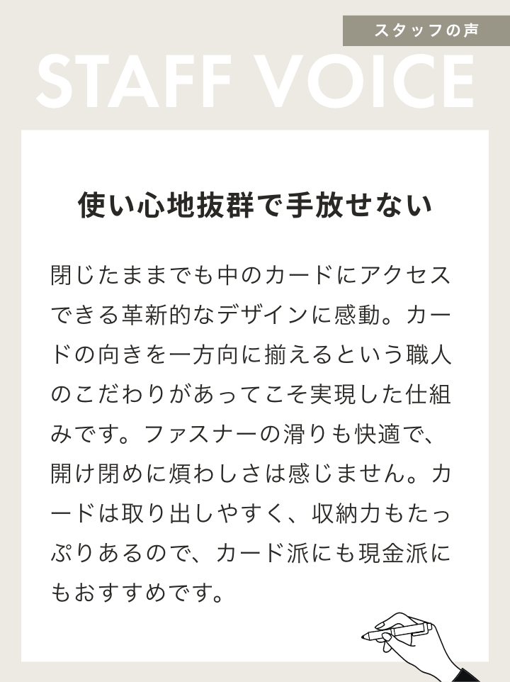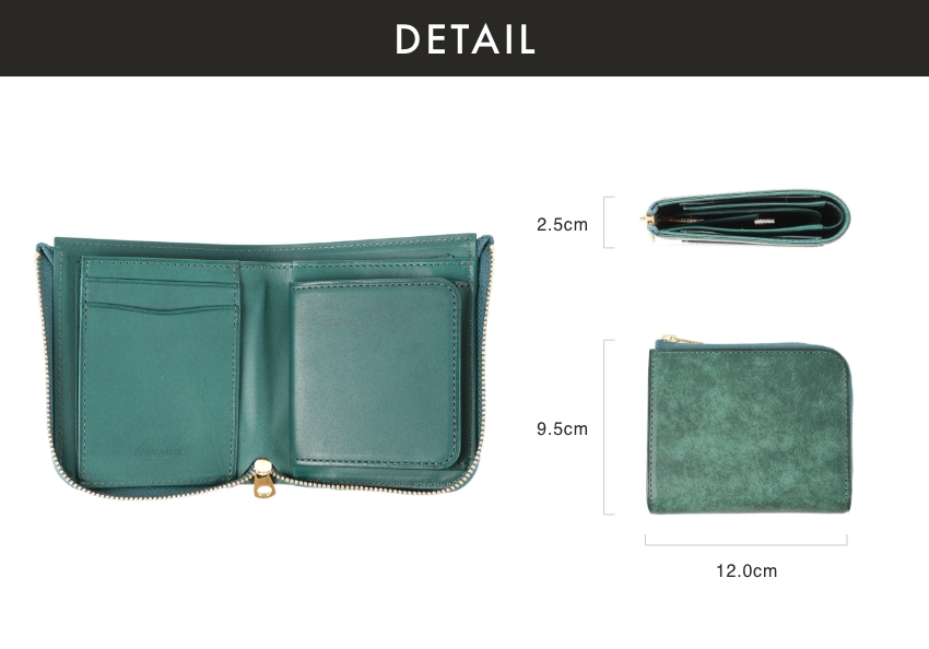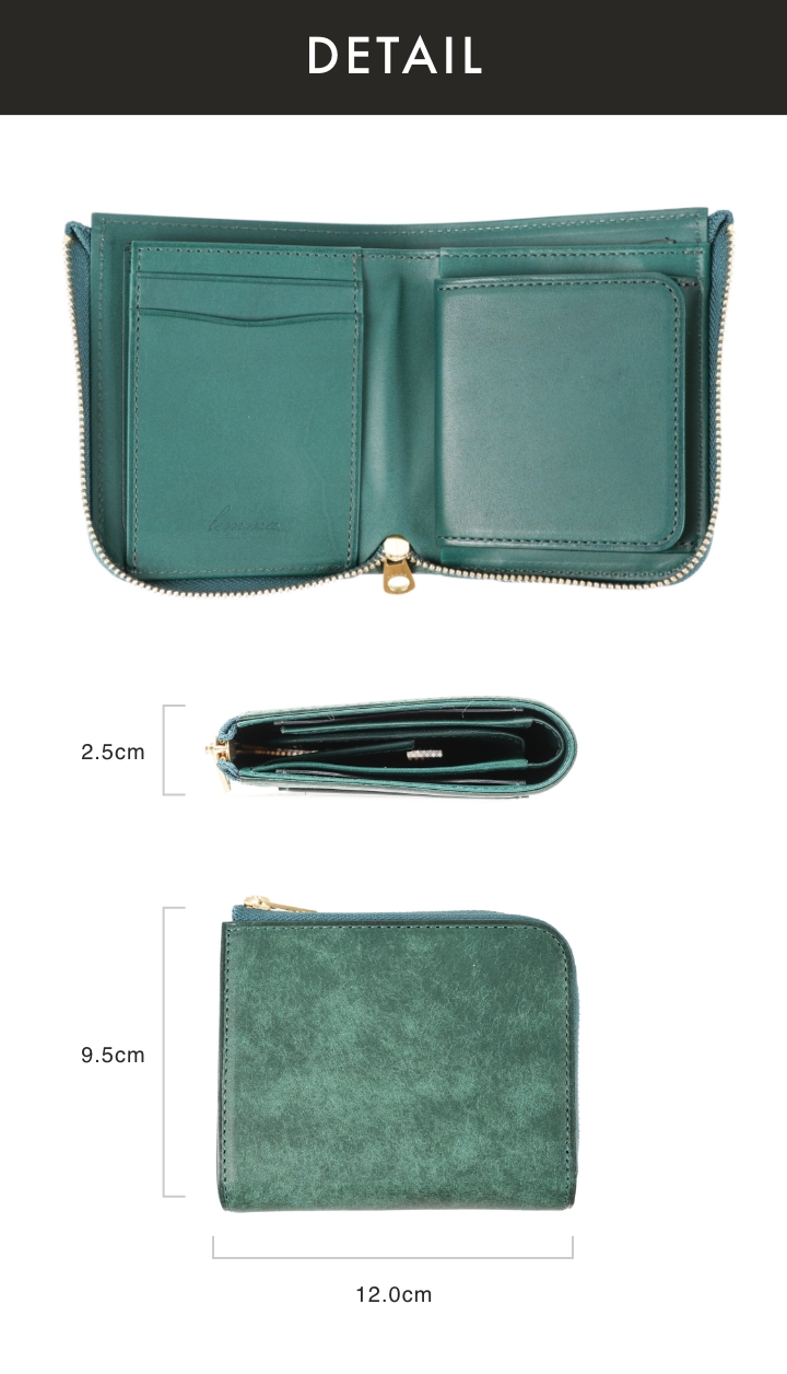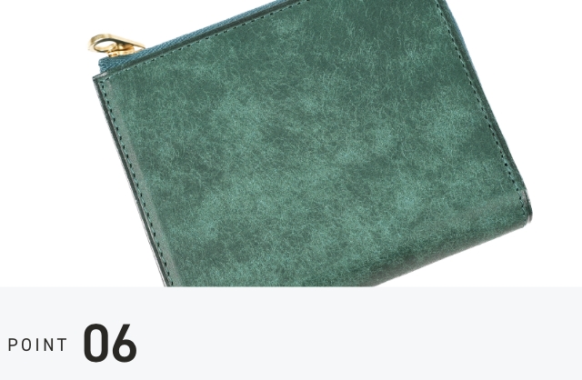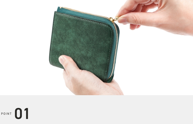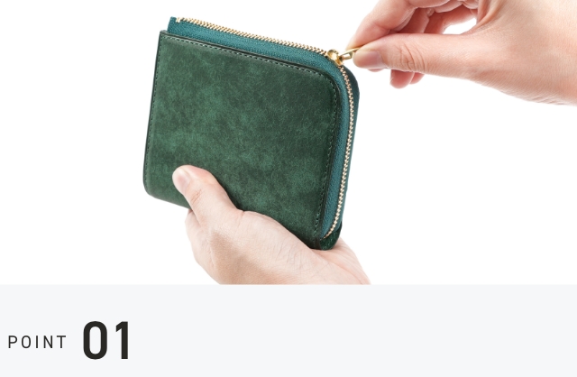 スナップボタンだと故障が心配、ラウンドファスナーは開閉が少し面倒。そんな方におすすめなのがL字ファスナータイプです。しっかり閉じてくれる安心感がありつつ、開閉のストロークが短いため、煩わしさもありません。