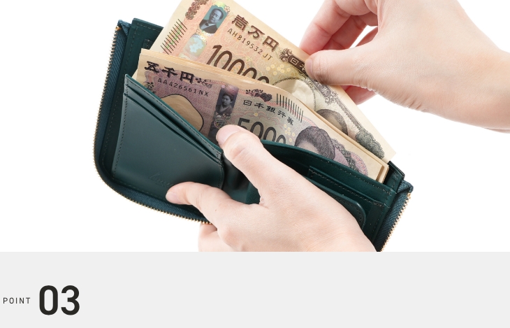 お札入れ部分は、片側をあえて縫わないことで大きく開く仕様に。お札が見やすく、出し入れもスムーズに行えます。片側がオープンになっているため、お札よりやや大きいサイズのレシートやチケットなども収納可能です。
