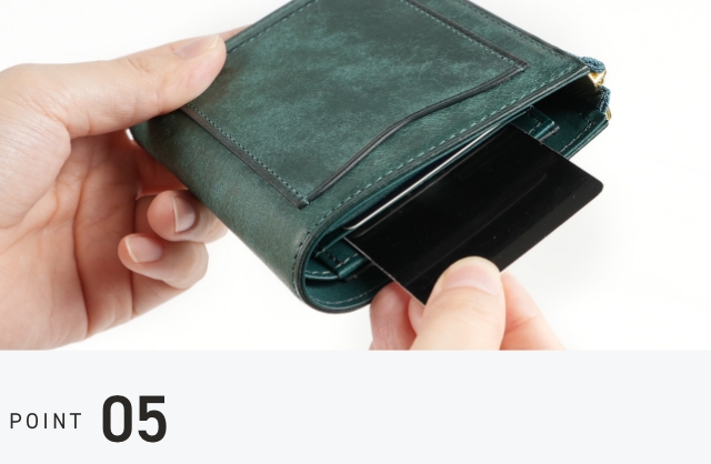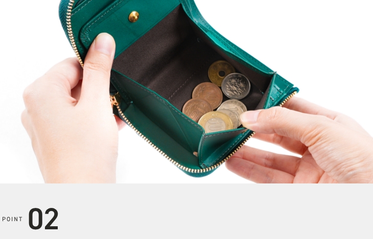 小銭入れには、大きく開くボックス型を採用。コンパクトなお財布ながら、小銭の視認性は抜群で、スムーズなお会計を実現します。約20枚のコインが収納可能なため、現金派の方にも安心してお使いいただけます。