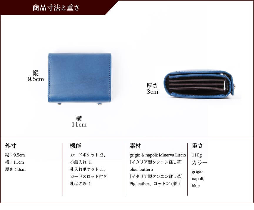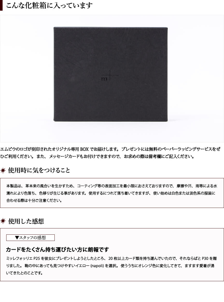 長財布しか使ったことがないので、悩みまくってミッレフォッリエ P30(napoli)を購入しました。