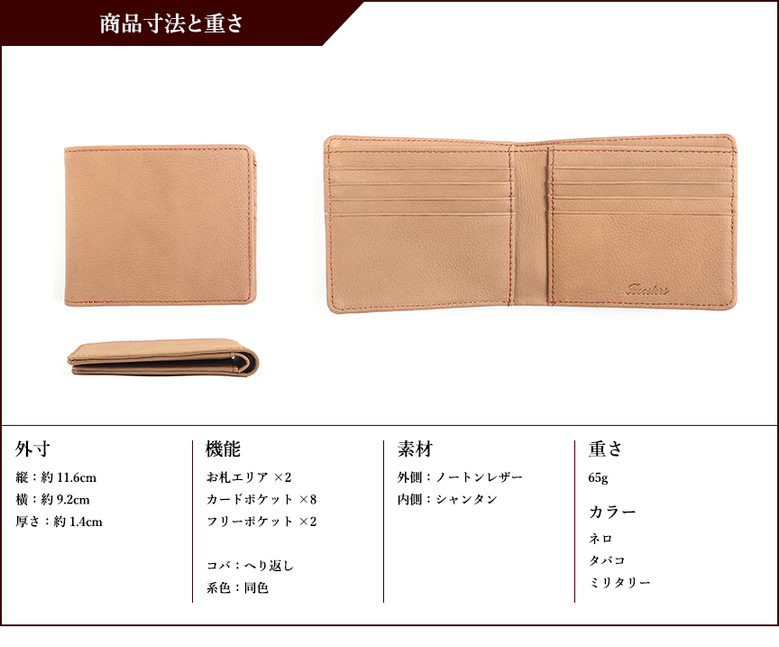 お札エリア×2ヶ所 カードポケット×8ヶ所 フリーポケット×2ヶ所 コバ:へり返し 系色:同色