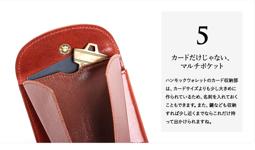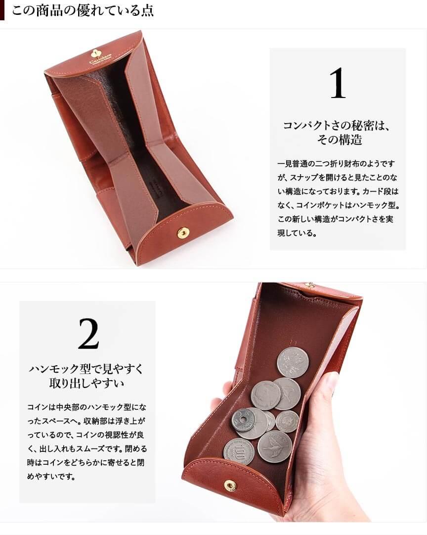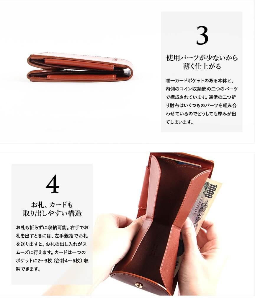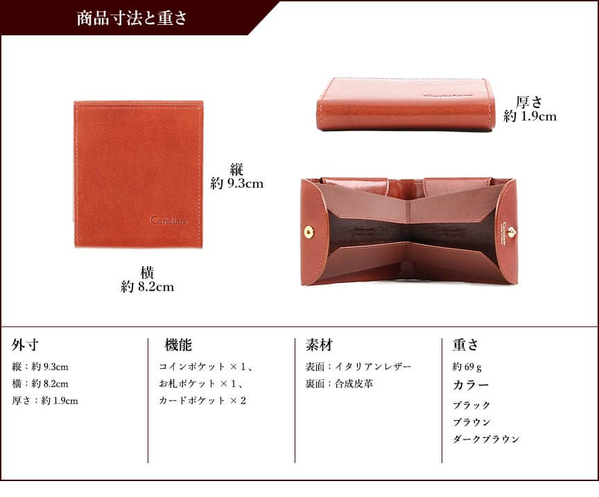 小銭入れ×1札入れ×1カード入れ×2本体外側:イタリアンレザー 内側:合成皮革