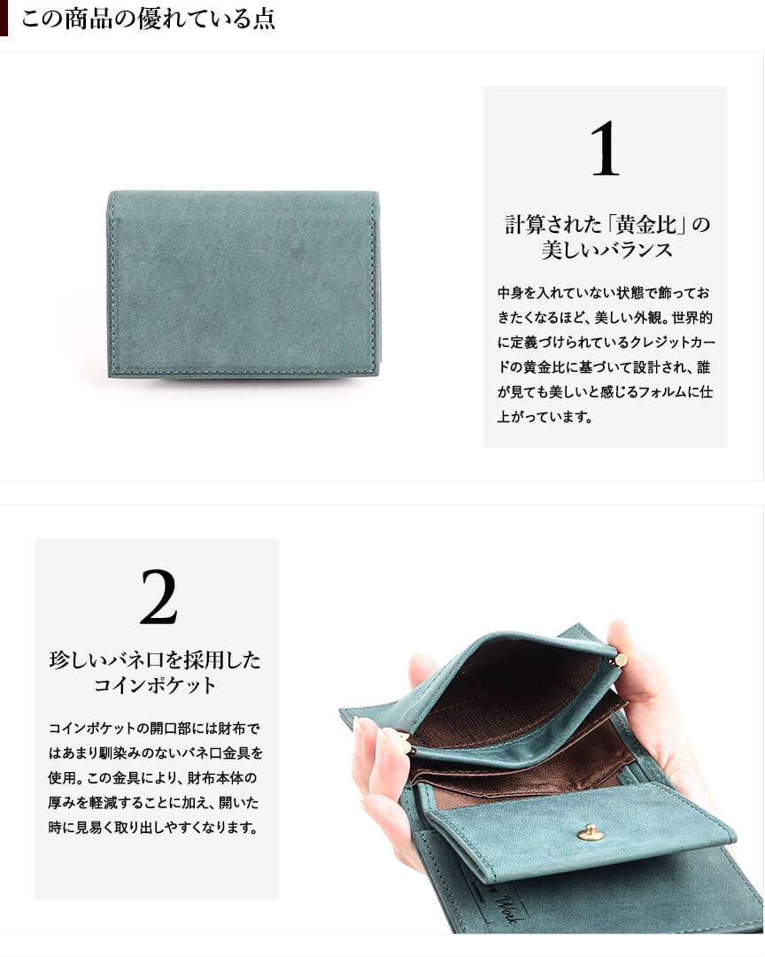 プレゼントで、ブルーグリーンのお色を頂きました。 使って日は浅いですが、お財布の色とデザイン、サイズがとても良いです! 当たり前ですがコンパクト財布なので、多くの小銭やカードを入れたい人には向いていないですね。 お手入れを重ねて大切に使わせていただきます。