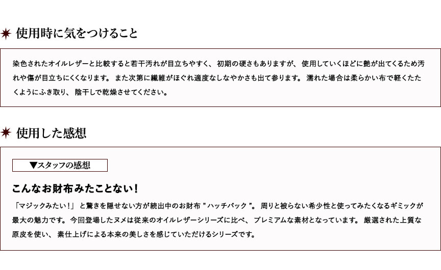ベルギーヌメのハッチバックを購入しました。 ゴールドのボタンがアクセントになり、財布を開いた時のおじさんのデザインが映えてすごくいい感じです。 これから大切に扱ってきれいなアメ色に育てていきたいと思います。