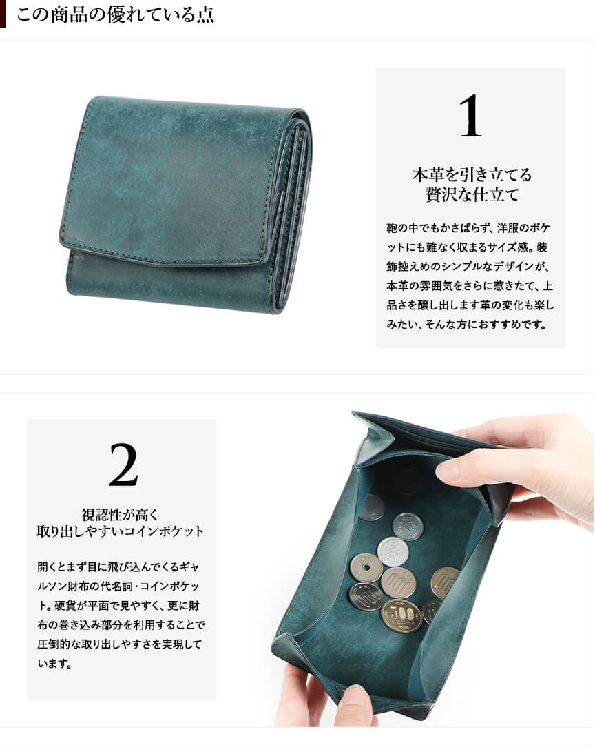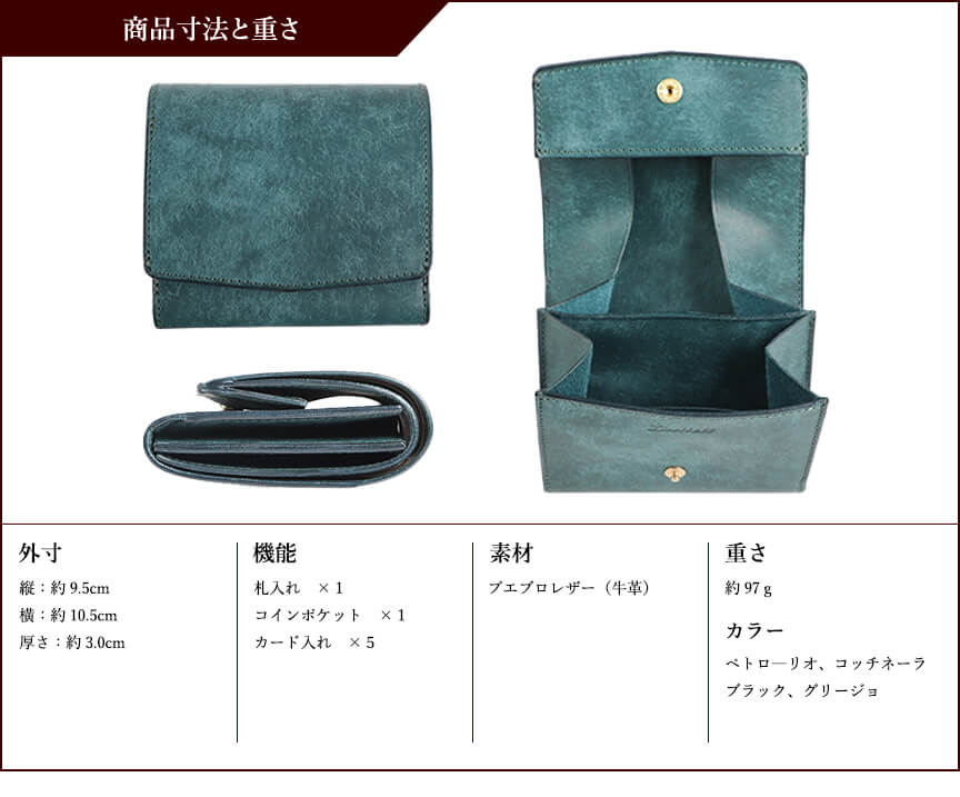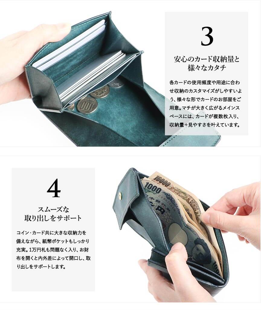 コインの取り扱い易さを重視してこちらのペトローリオを購入しました、 とにかくコインの出し入れが楽ちん、 カード入れは七枚いれてますがこちらもマチが広いので取り出しやすいです、お札の出し入れは狭いかなと思ってましたが何故かしやすい(笑) 蓋を開ければ全ての動作に繋がる簡単さも気に入りました、 後は革の変化を楽しみながら長年愛用していきたいと思います。