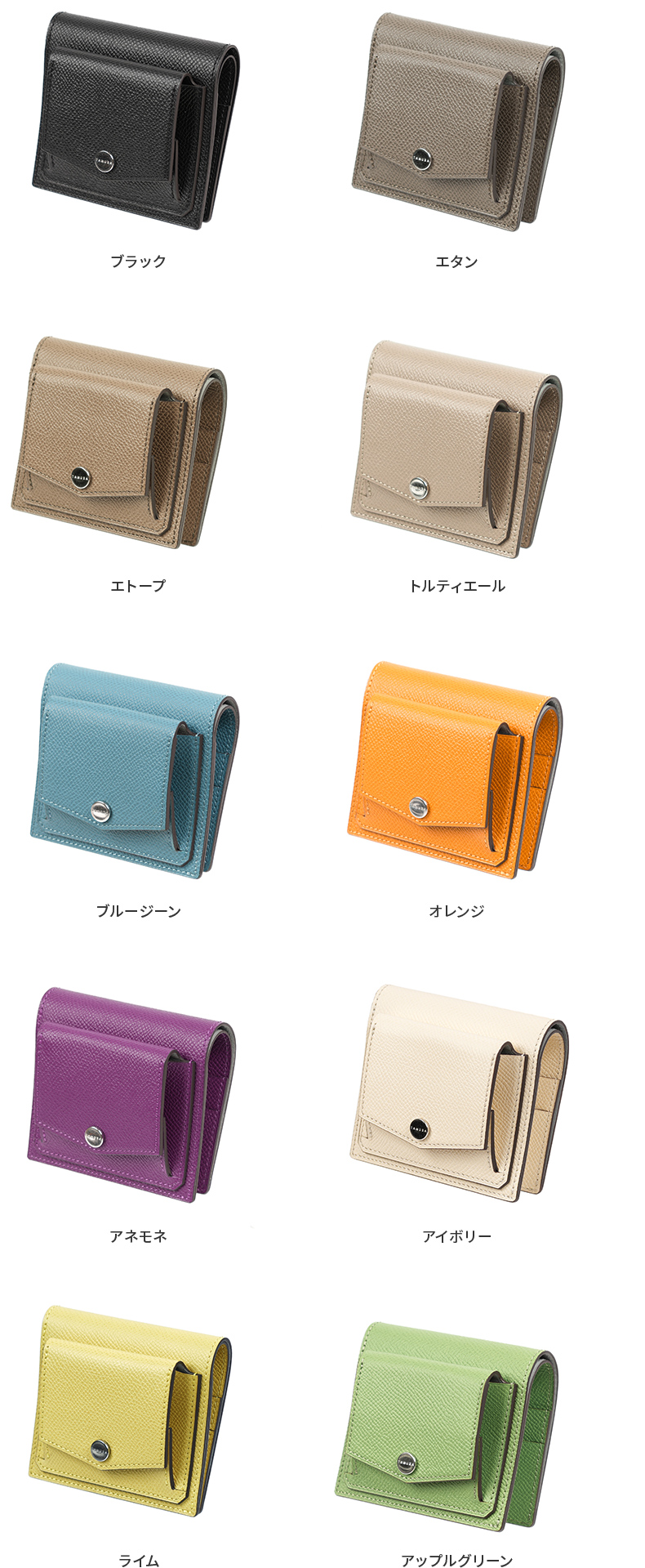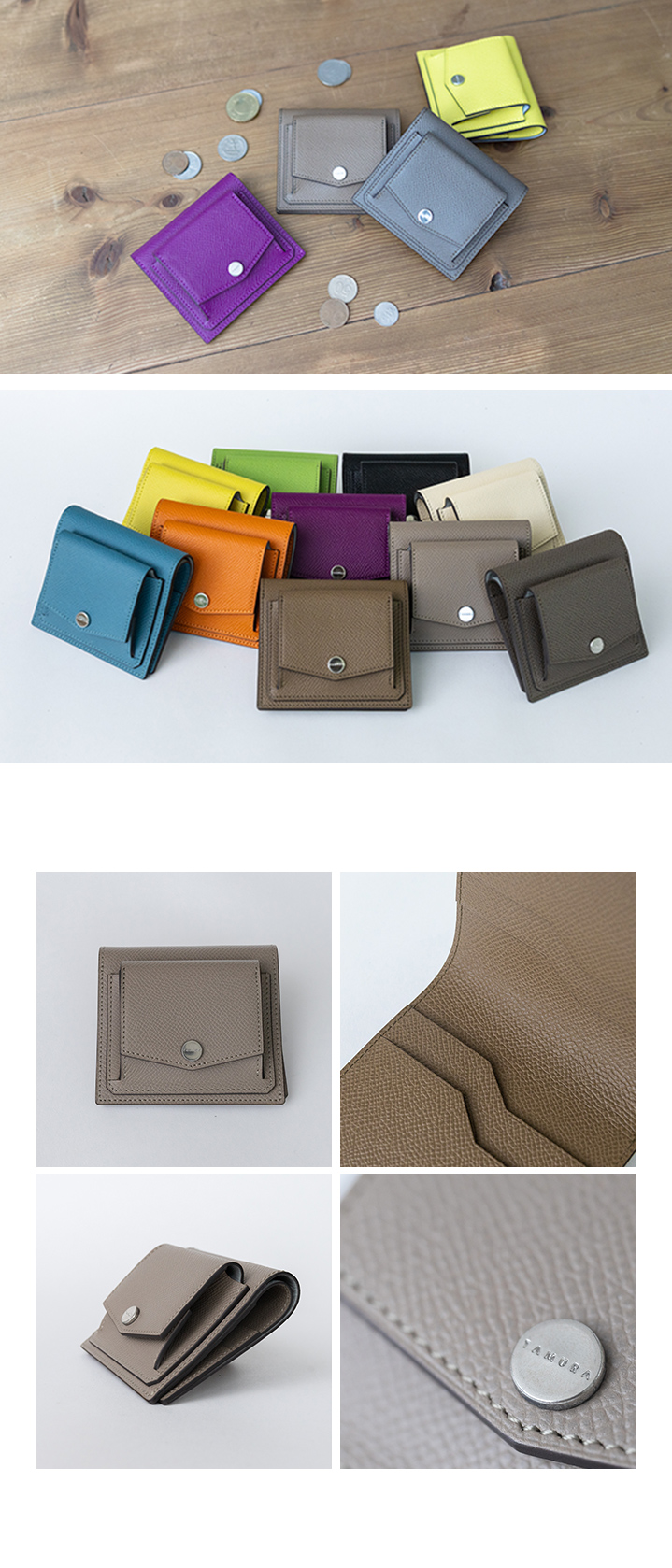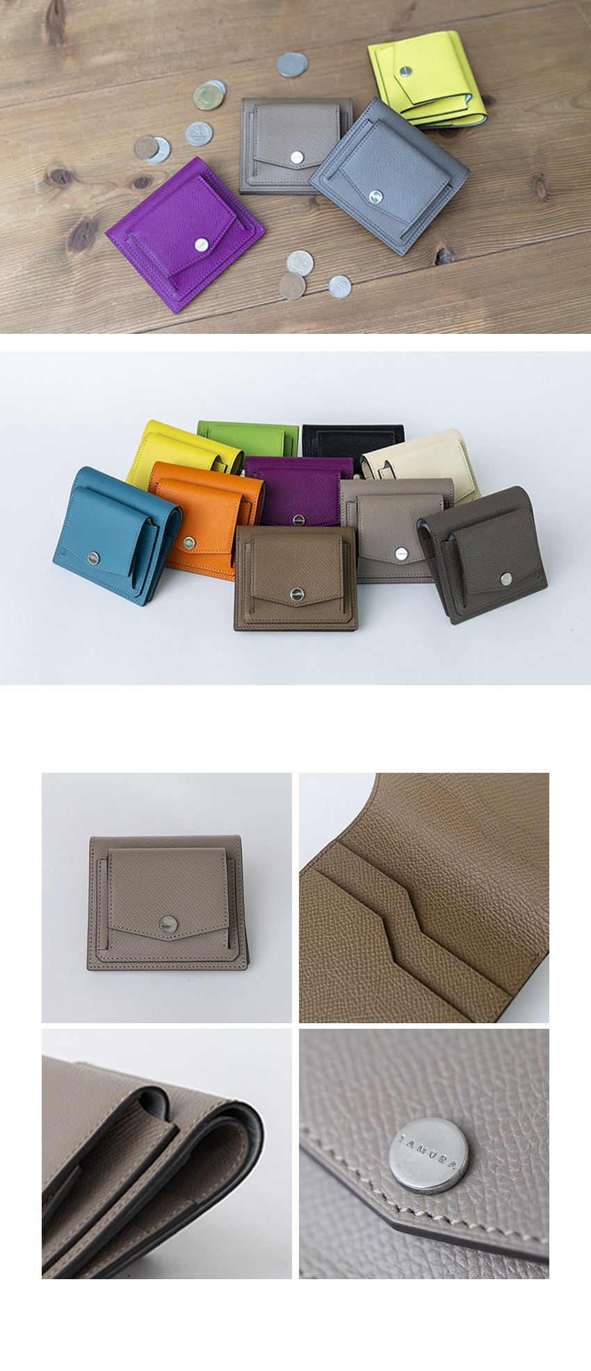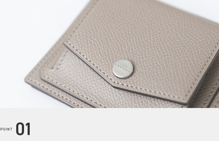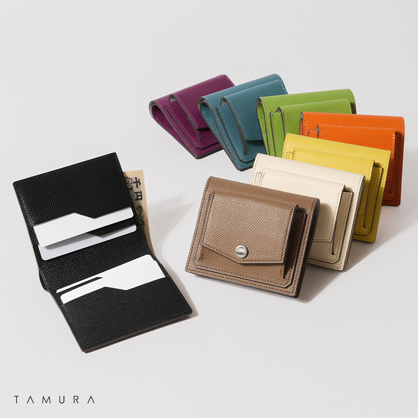 タムラのShaulaミニ財布は、生後5ヶ月未満の子牛革(カーフ)を使用し、型押し加工で表面を強化しています。鮮やかな発色ときめ細やかな繊維が特徴で、傷や擦れに強く設計されています。日常使いに耐える丈夫さと上品さを兼ね備え、シンプルな美しさが際立つ逸品です。