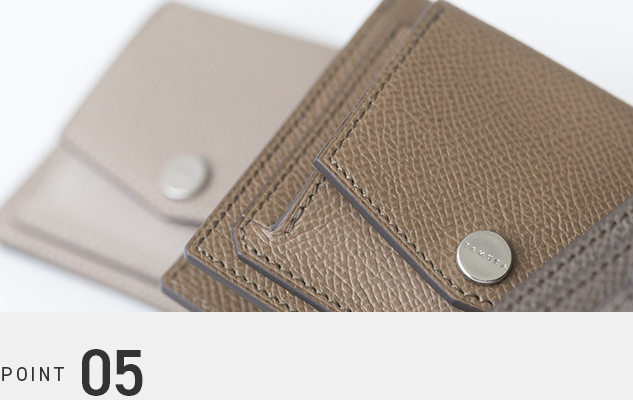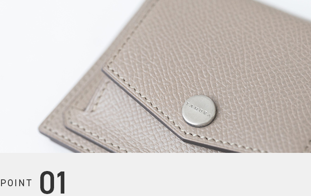 Shaulaミニ財布には、生後約6ヶ月の子牛革(カーフレザー)を採用しています。細密な繊維構造がもたらす柔らかな質感は手に自然に馴染みます。また、型押し加工を施すことで傷が目立ちにくく、日常的な使用にも適しています。