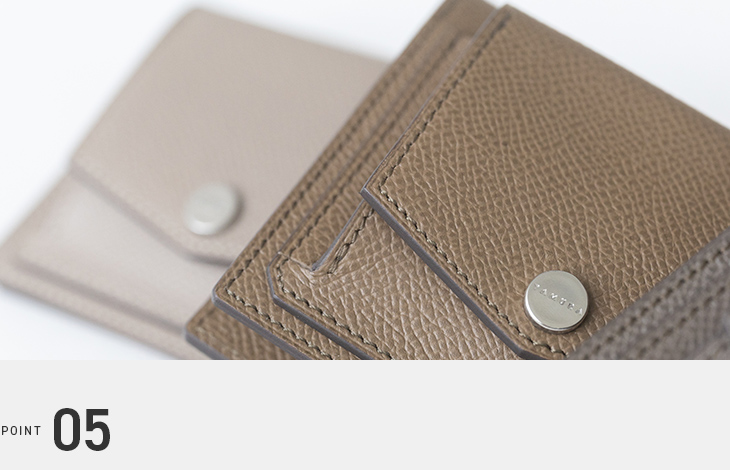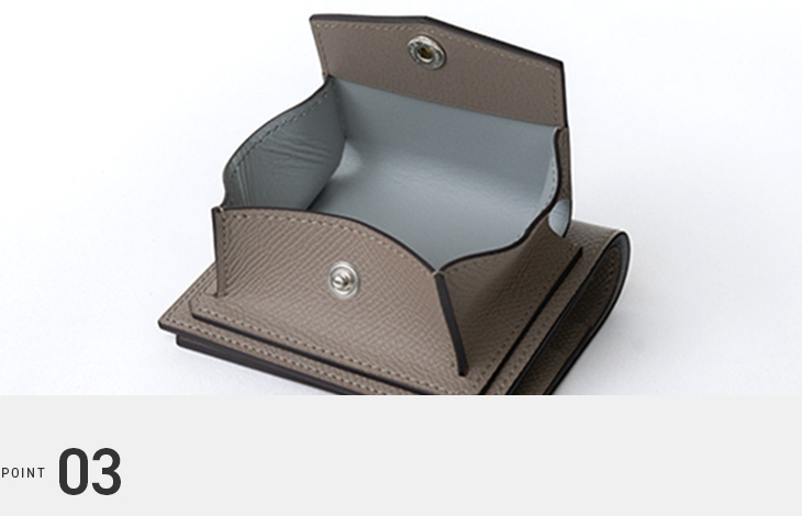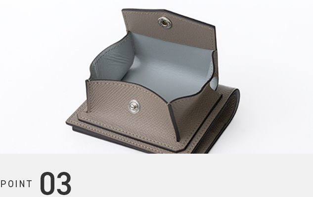 内部はカードや小銭を快適に取り出せるよう設計されており、使い勝手のよさが際立っています。大きく開くコインポケットや、工夫を凝らした仕切りによって、視認性と取り出しやすさを実現。日常の使用でもストレスを感じさせません。