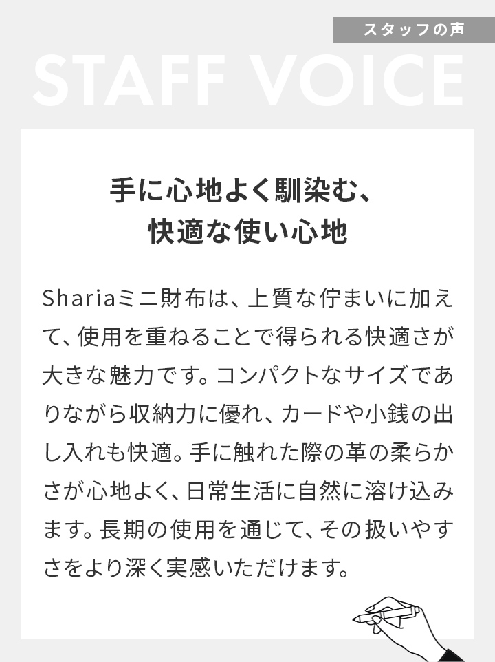 キャッシュレス化が進展する現代において、必要なものだけをスマートに携えられる「Shaulaミニ財布」。手のひらに収まる小さなサイズでありながら、カード、紙幣、小銭を整然と収められる機能的な設計が特徴です。厳選された革による上質な仕立てが、日常に洗練された品格を与えます。時代の流れに寄り添いながら、長く愛用できる逸品です。