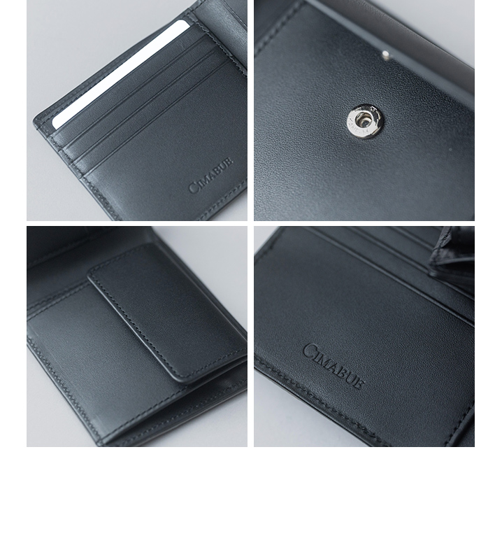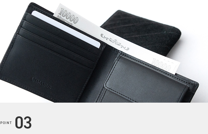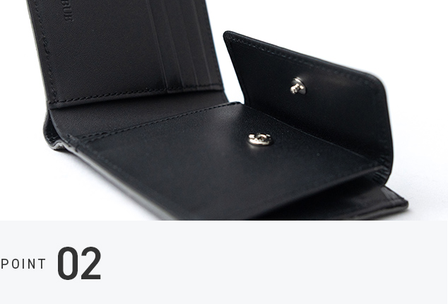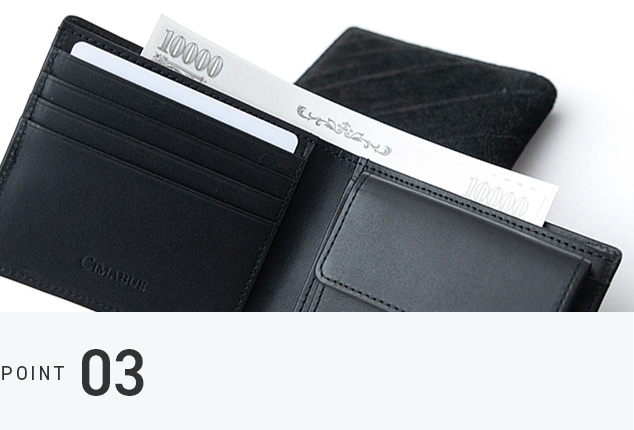 紙幣の収納は2箇所。紙幣の仕分けはもちろん、商品券やクーポン、レシートもすっきり整理できます。仕切りにまで黒ヌメ革を使用するなど、細部にまで一切の妥協なし。内装は吸湿性と通気性に優れたコットン素材です。